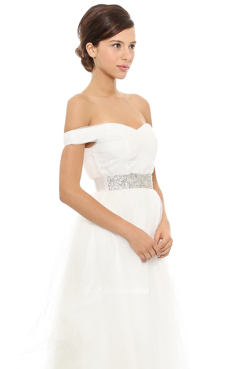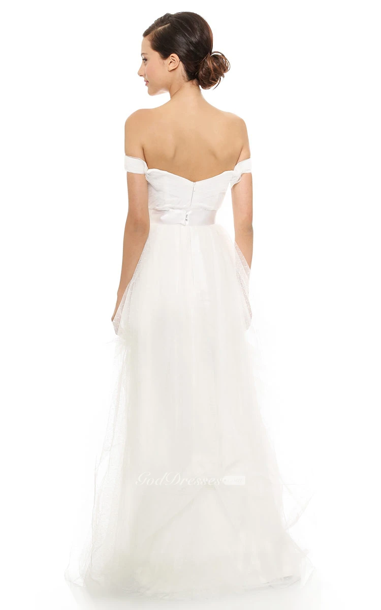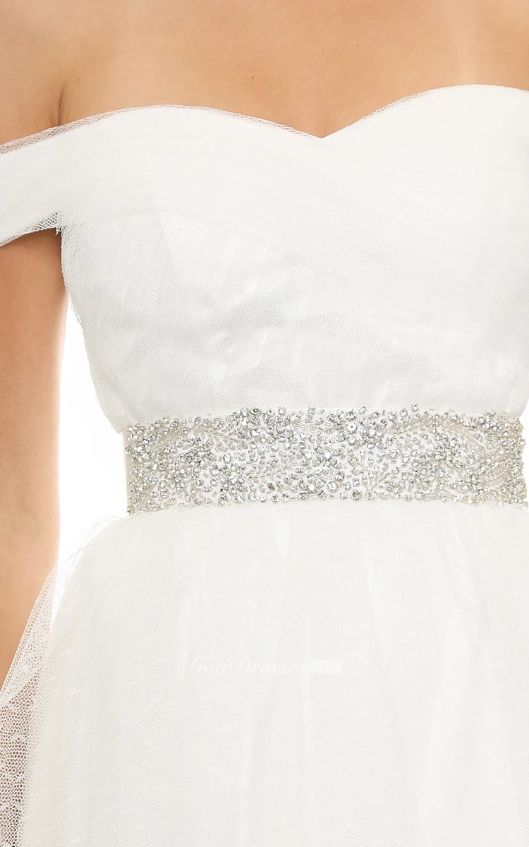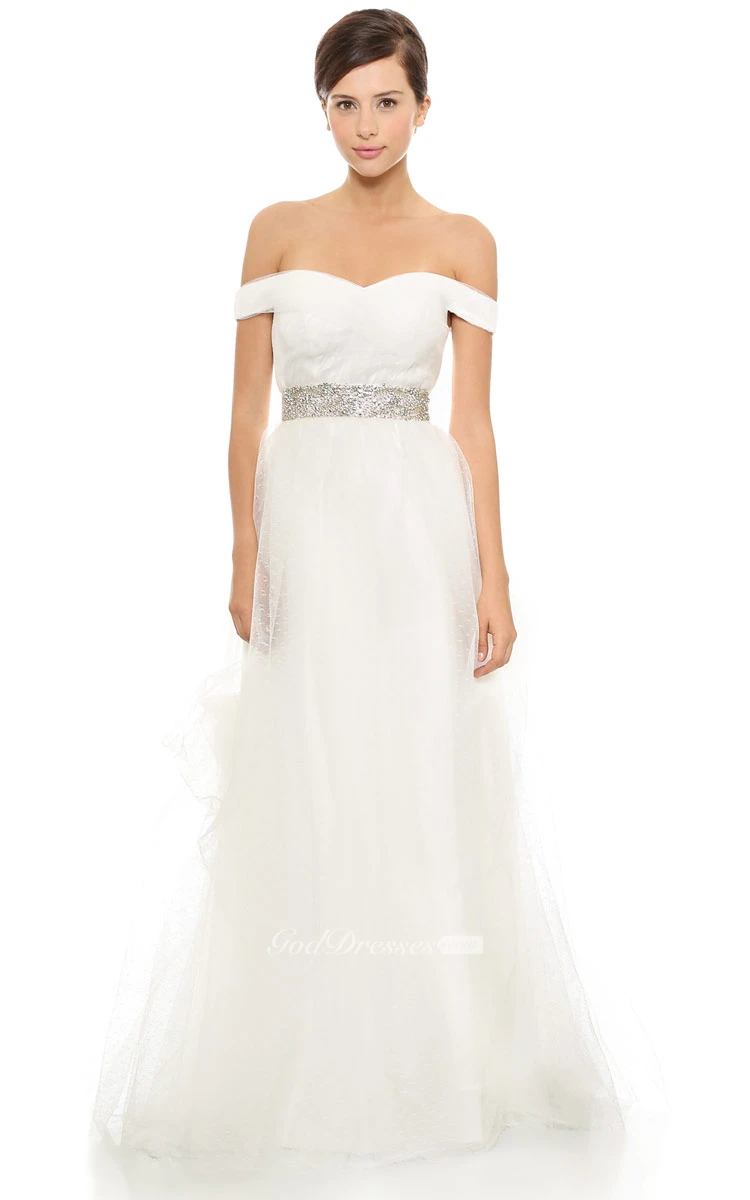 Long Off-shoulder Empire Organza Dress With Beaded Belt
