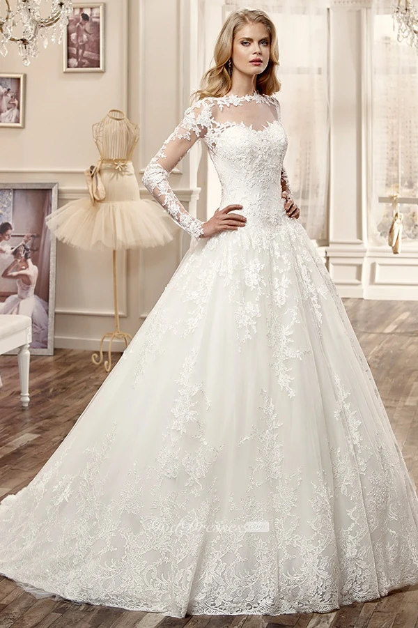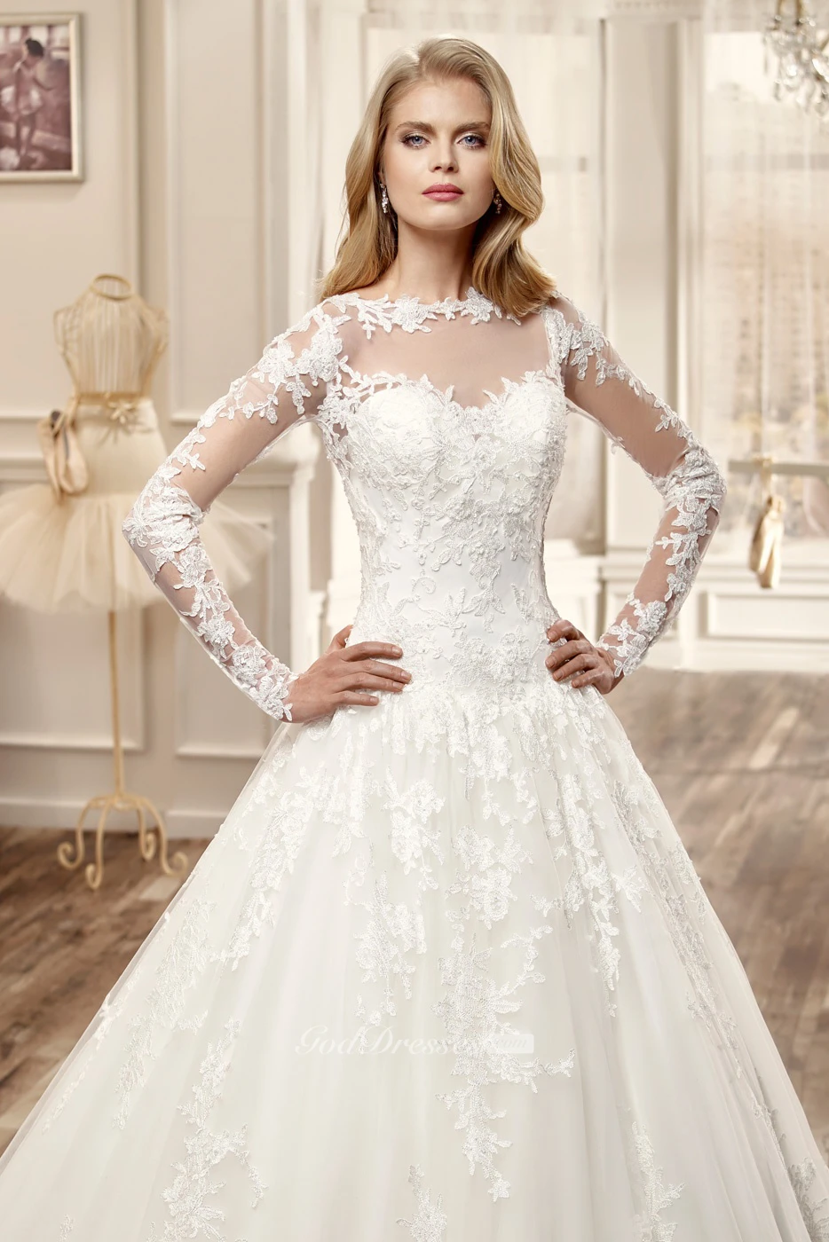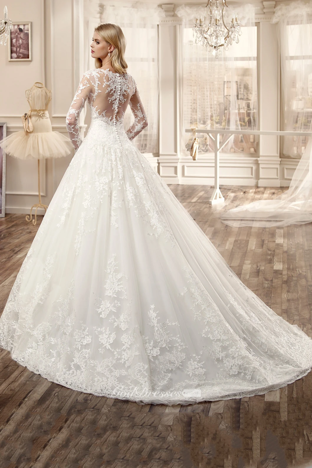 Long-Sleeve A-line Wedding Dress with Brush Train and Appliques