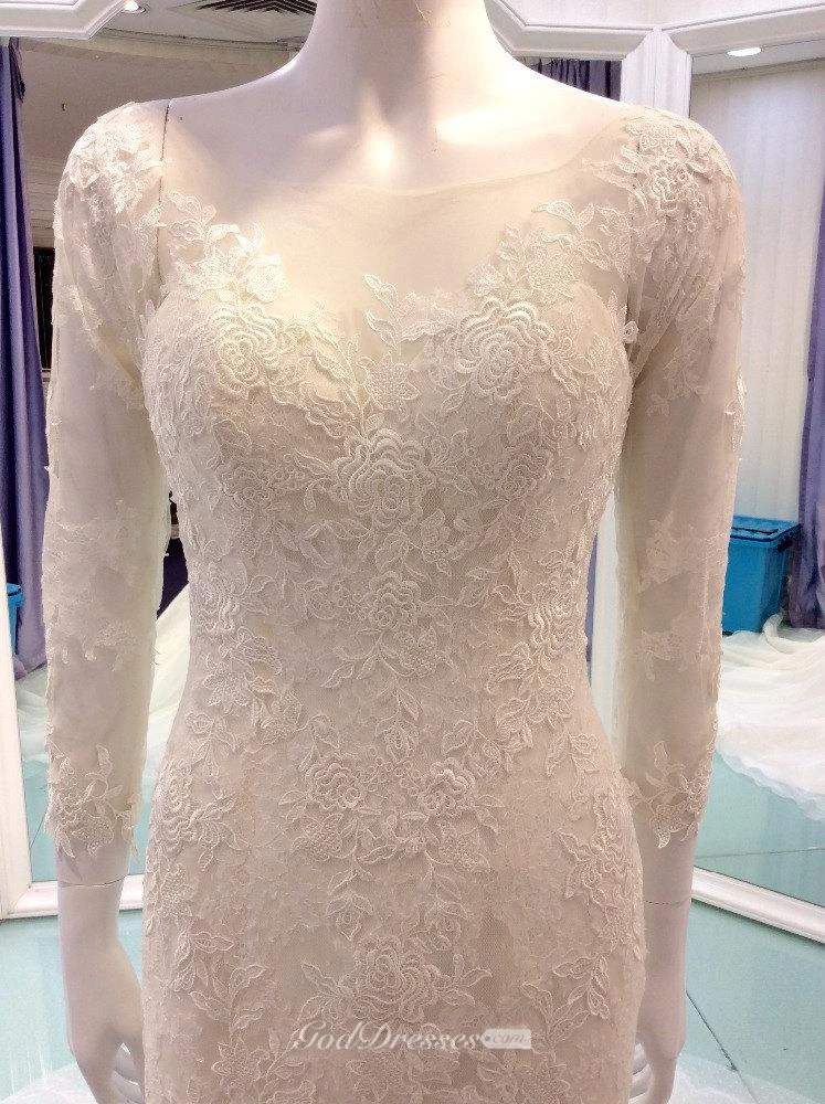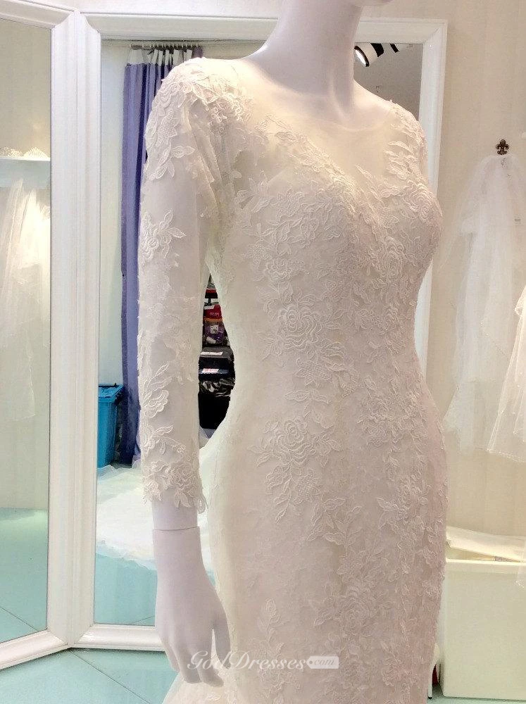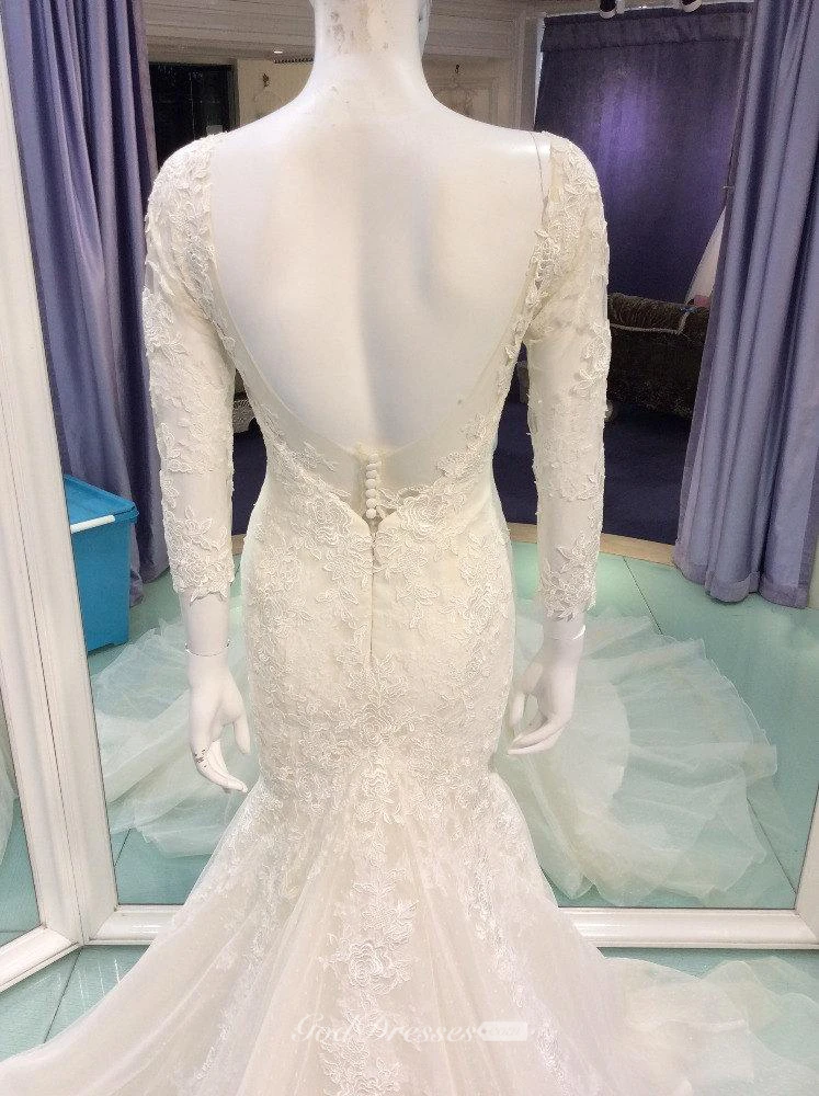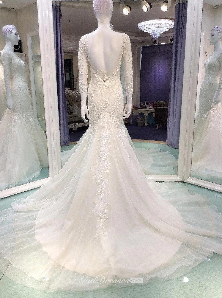 Long Sleeve Bateau Neck Lace Mermaid Dress With Low-V Back
