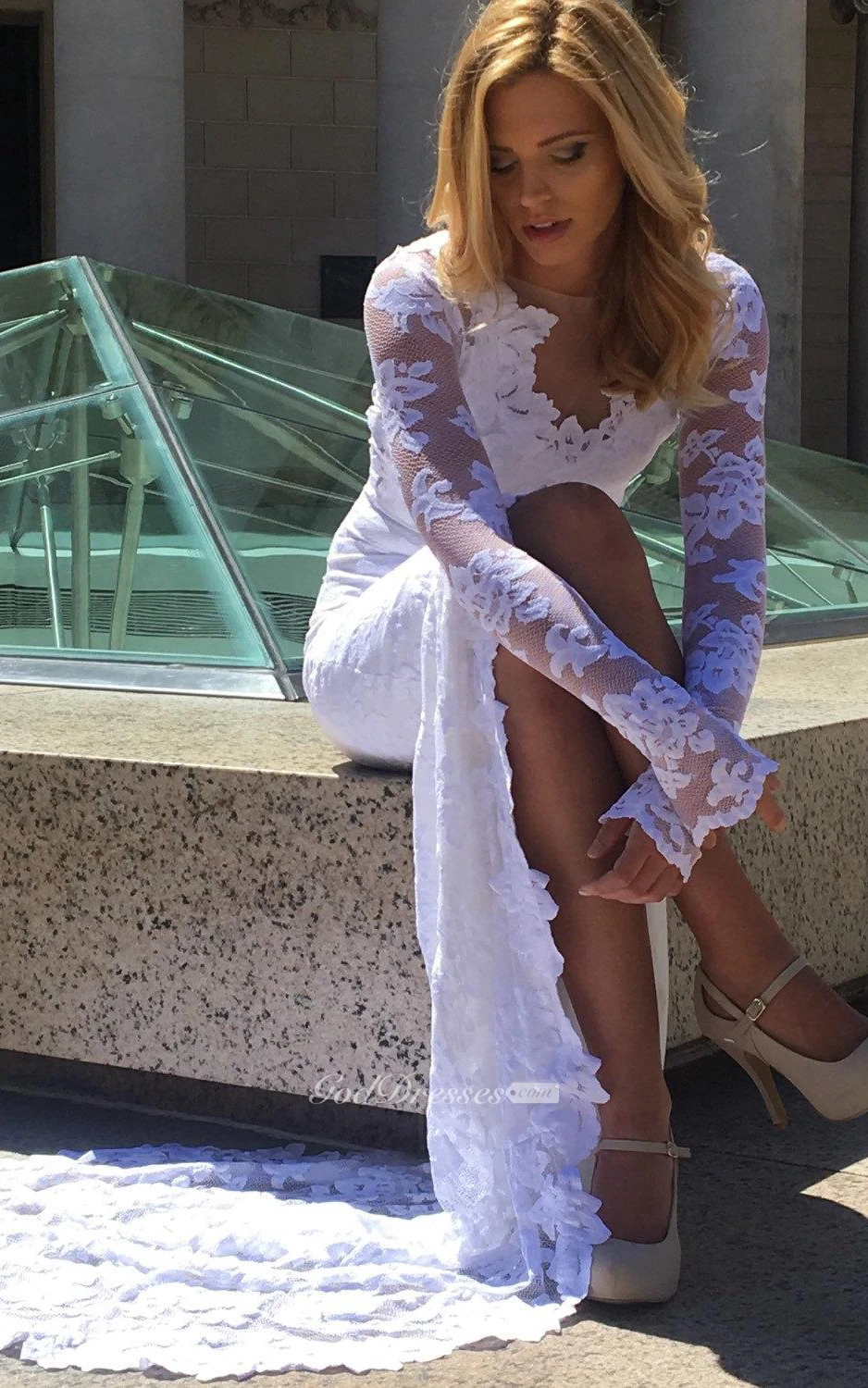 Long Sleeve Chapel Train Lace Dress With Appliques Flower