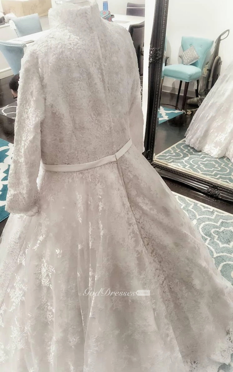 Long Sleeve High Neck A-Line Lace Dress With Slime Satin Belt