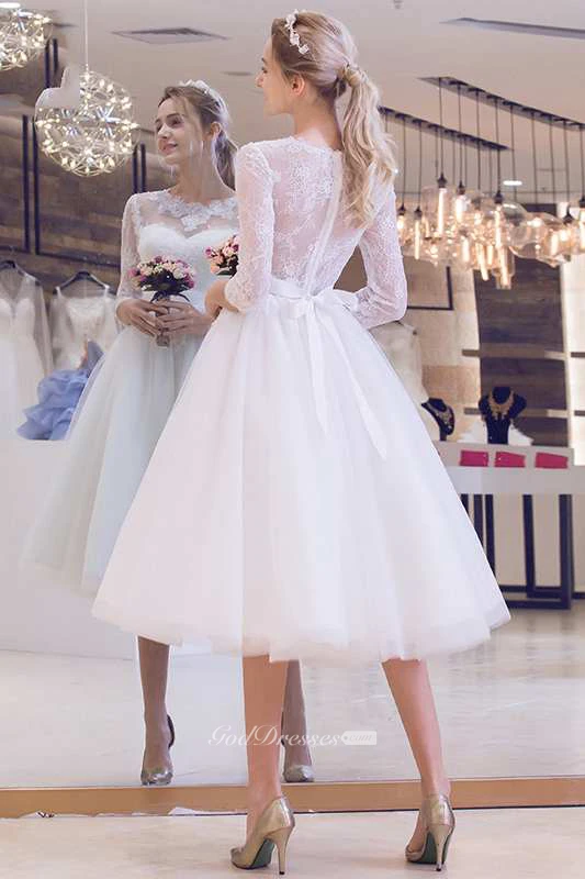 Long Sleeve Jewel Neck Pleated Tea Length Lace Dress