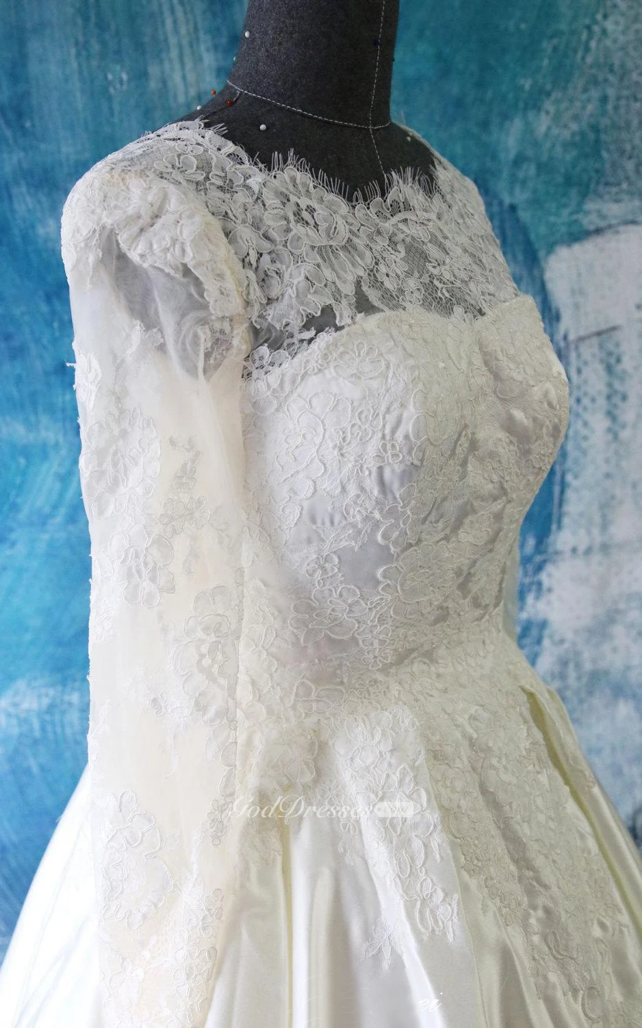 Long Sleeve Lace and Satin A-Line Bridal Dress With Low-V Back