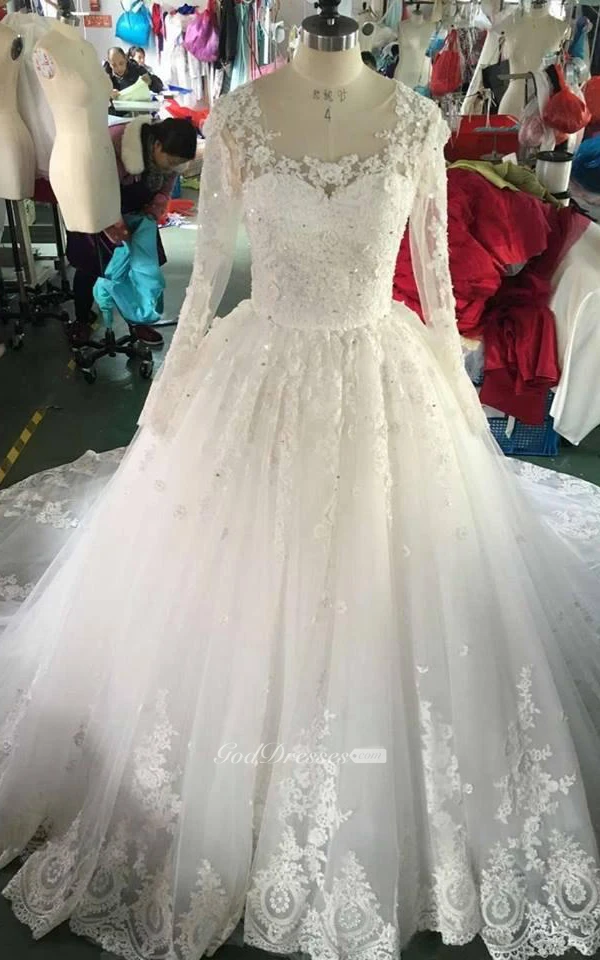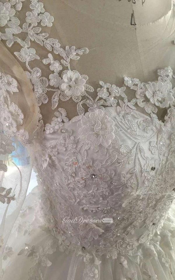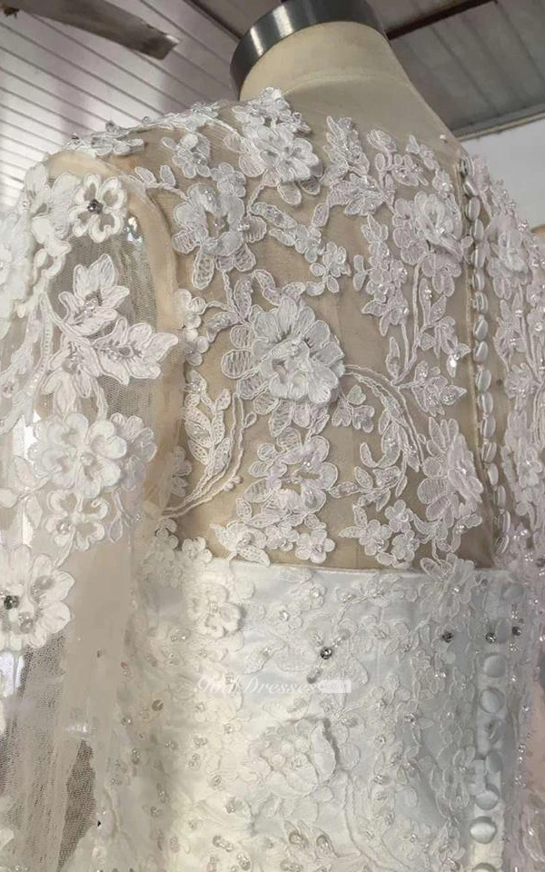 Long Sleeve Lace Appliqued Organza Dress With Illusion Back