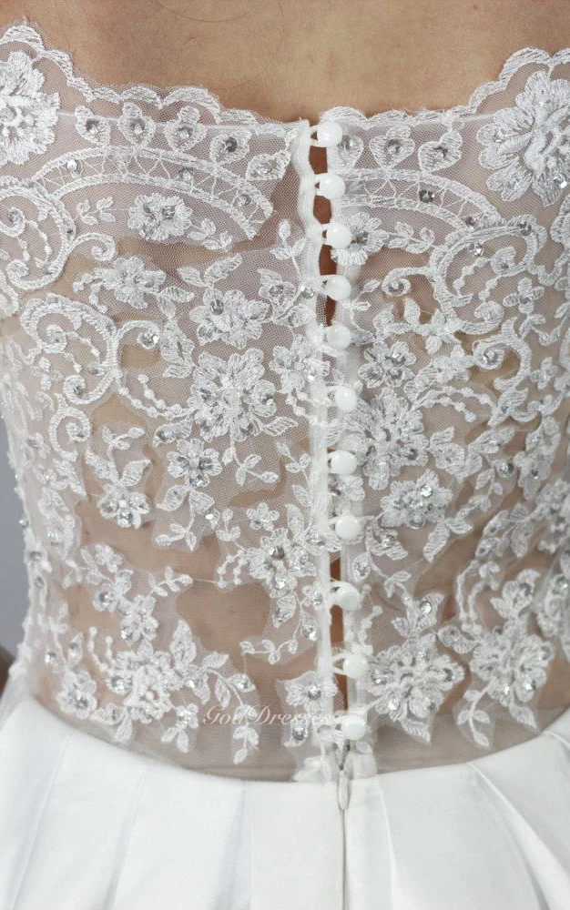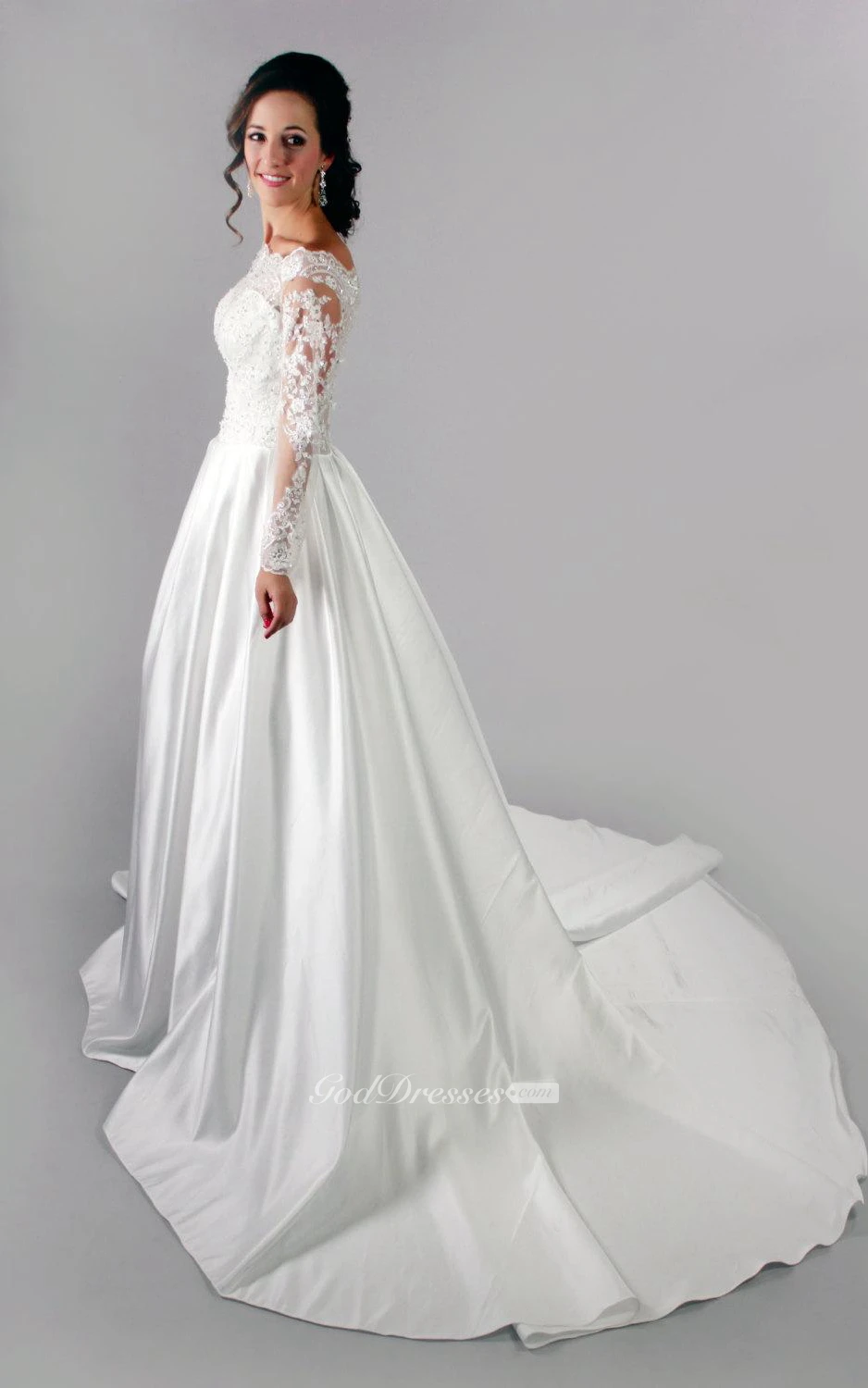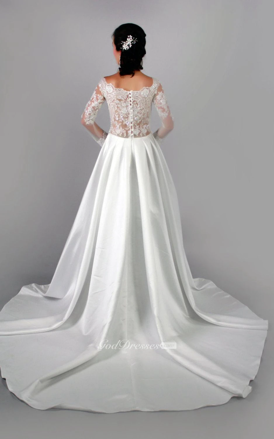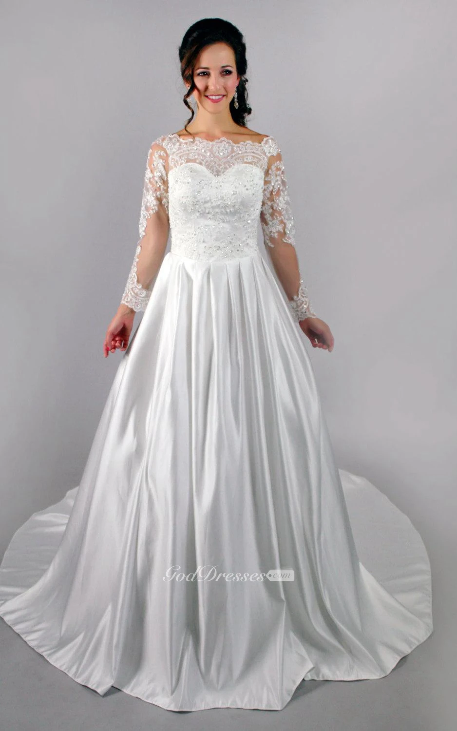 Long Sleeve Lace-Bodice Satin Dress With Beadings and Pleats