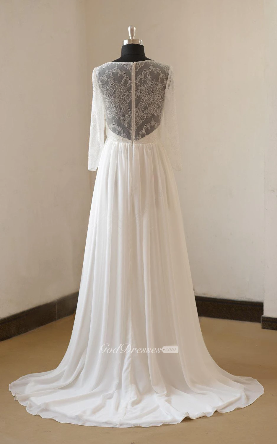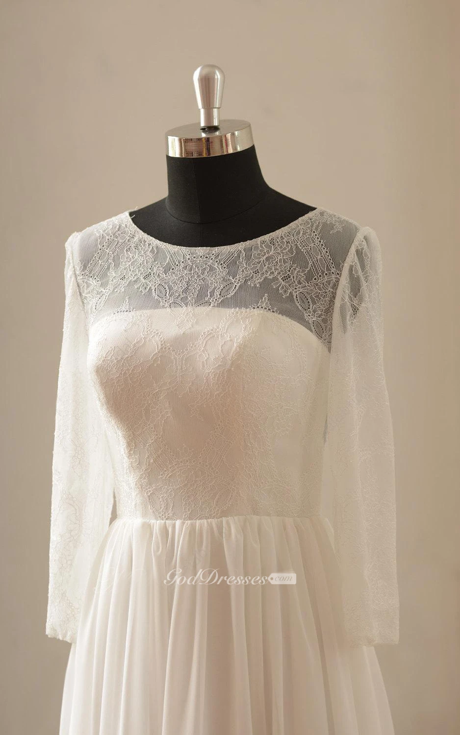 Long Sleeve Pleated Chiffon A-Line Dress With Jewel Neckline and Lace Bodice