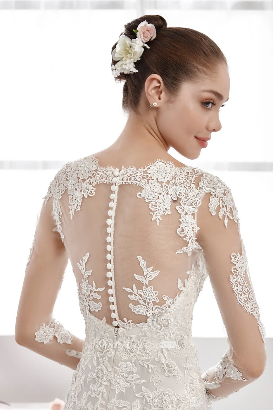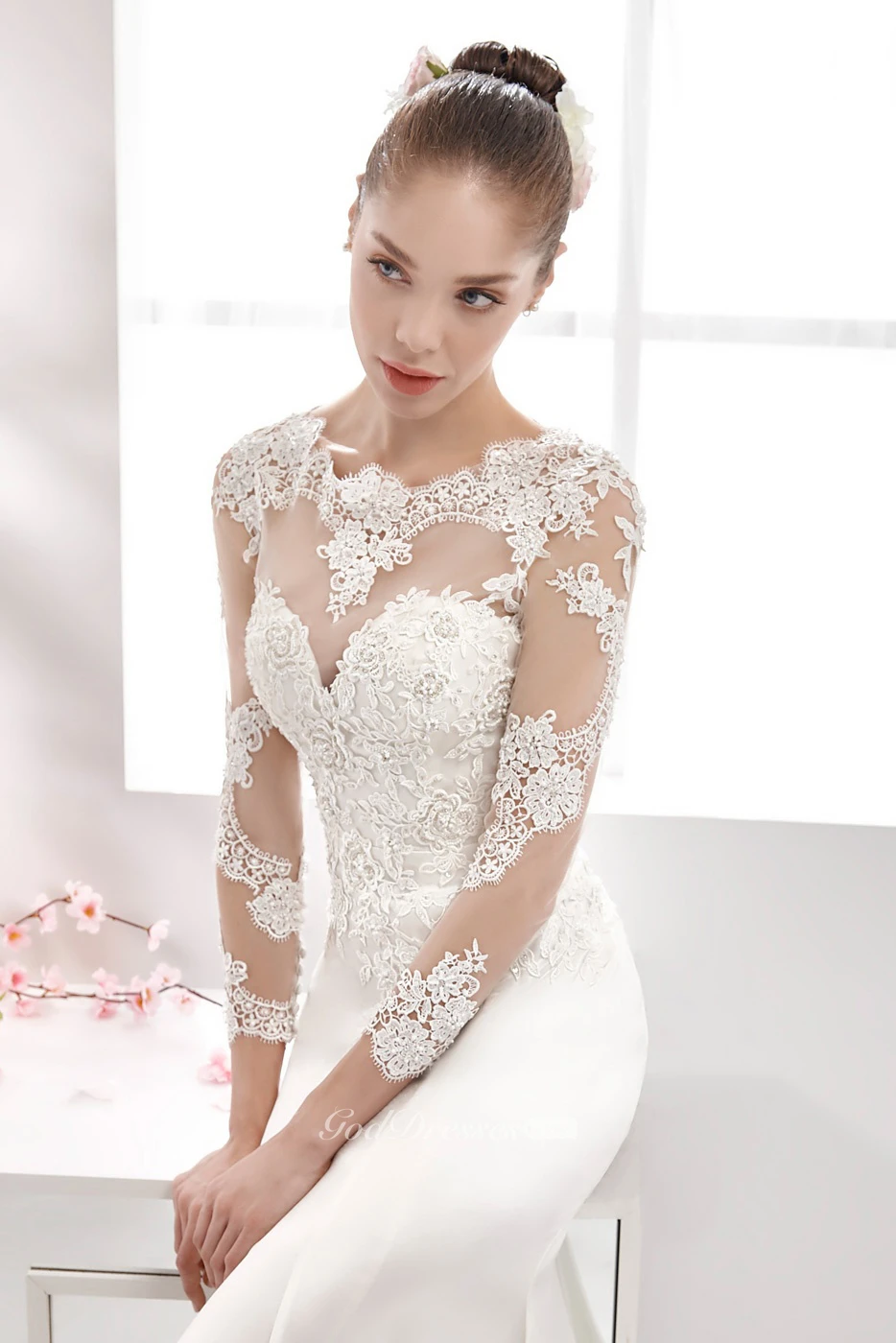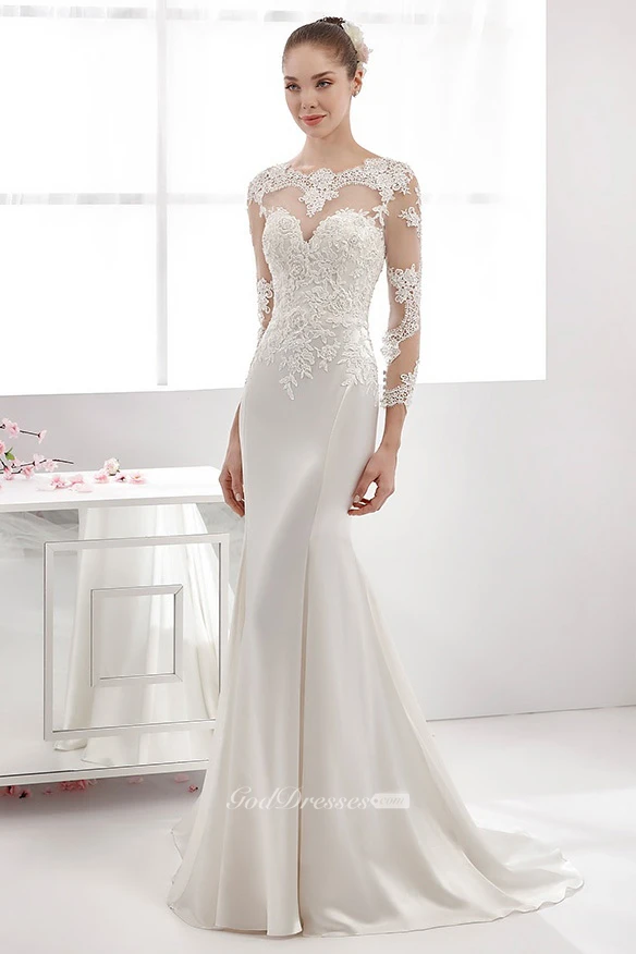 Long-Sleeve Sheath Satin Wedding Dress With Lace Appliques Bodice And Scalloped Neckline