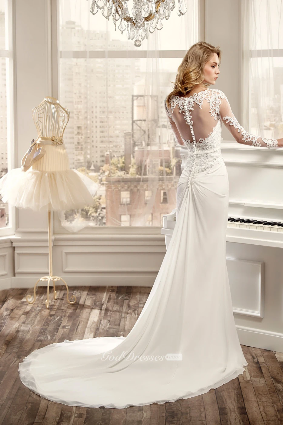 Long-Sleeve Sheath Wedding Dress With Brush Train And Back Draping