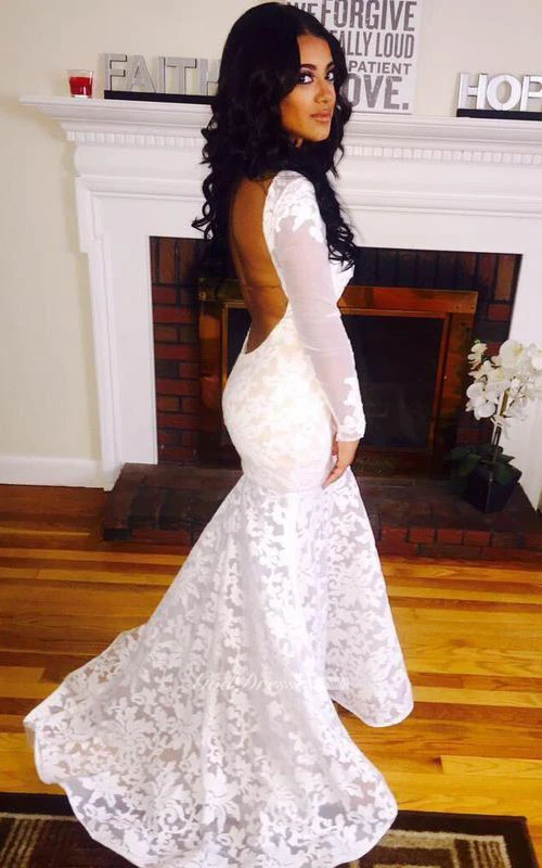 Long Sleeve Sweep Train Mermaid Backless Lace Dress