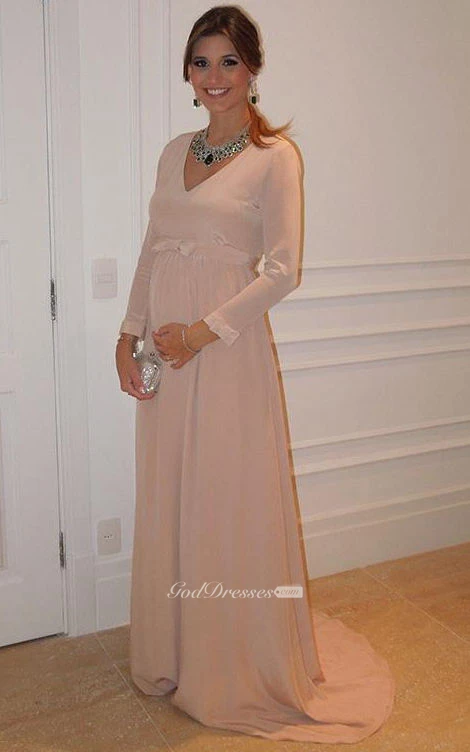 Long-sleeved V-neck A-line Chiffon Dress with Bow