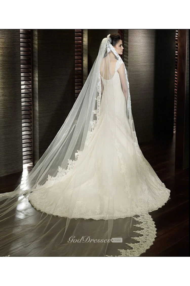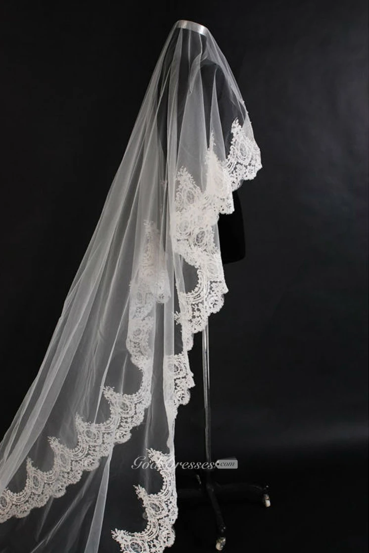 Long Soft Tulle Bridal Veil with Lace Appliques