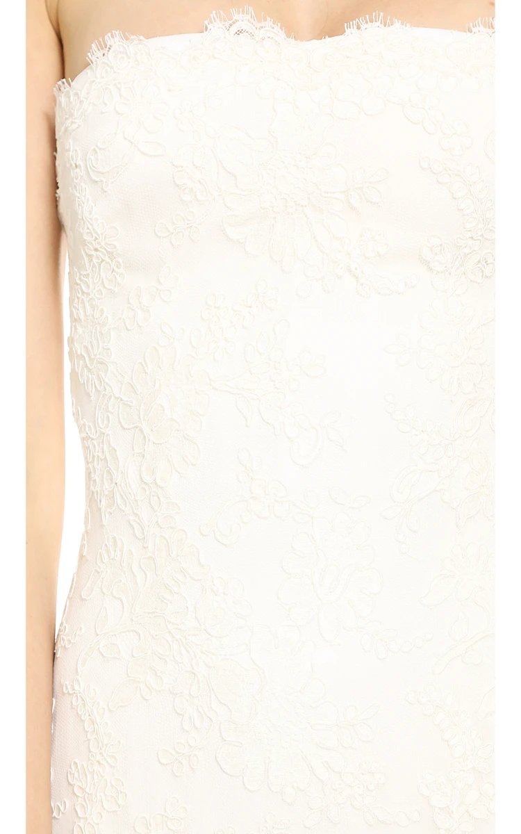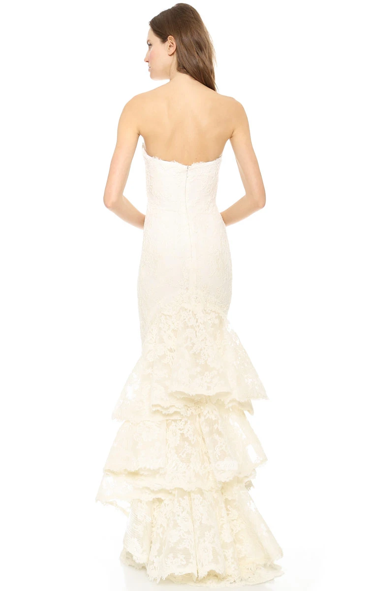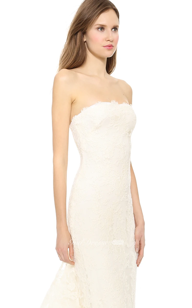 Long Strapless Sheath Lace Dress With Back Ruffles