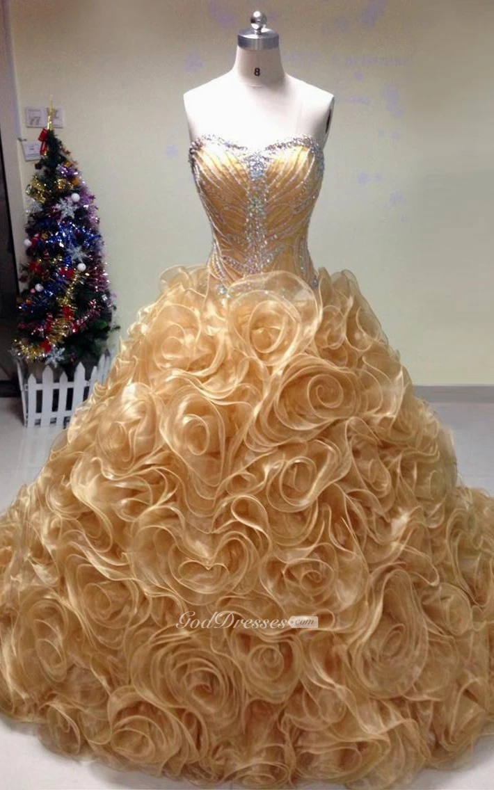 Long Sweetheart Beading Flower Brush Train Zipper Lace-Up Back Lace Organza Dress