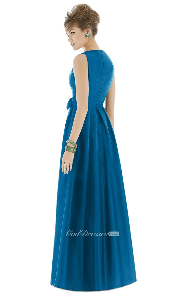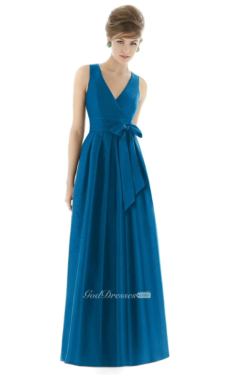 Long V-Neck Sleeveless Ruched Satin Gown with Side Bow Sash and Pleats