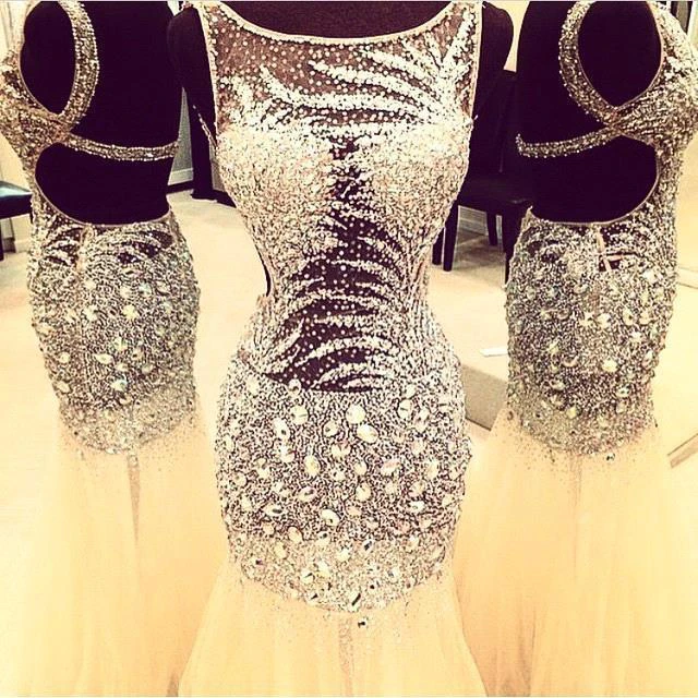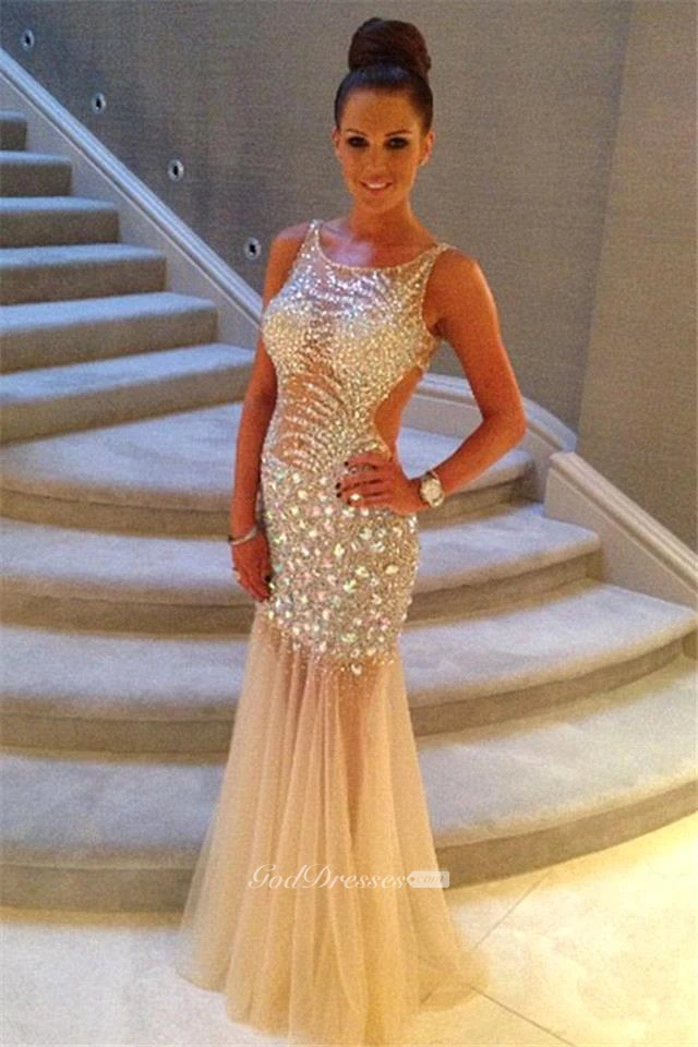 Luxurious Sleeveless Mermaid Prom Dresses Crystals Tulle Floor Length