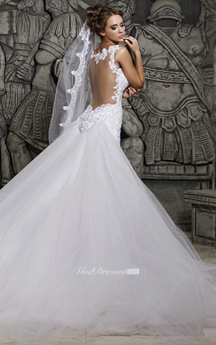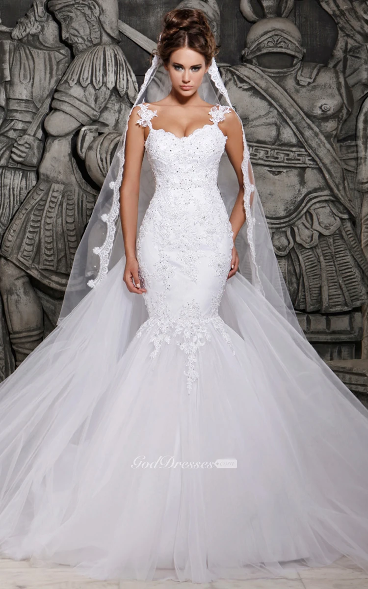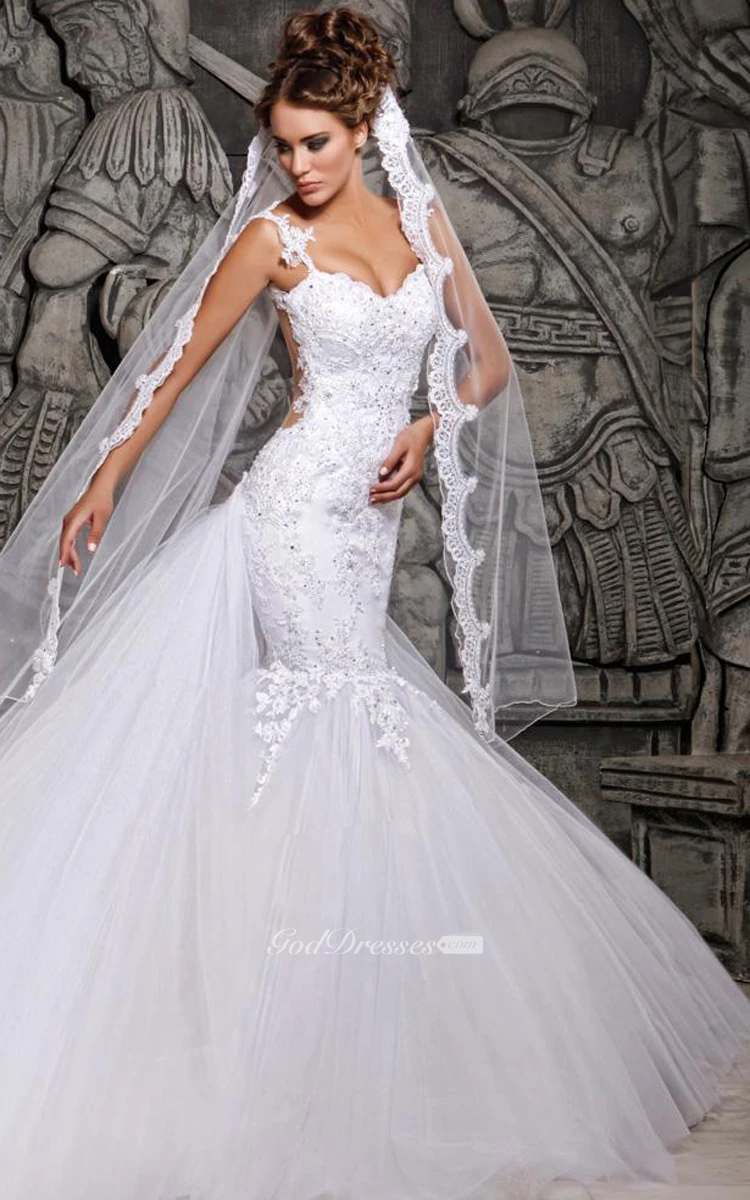 OMG! I am at loss of words to express the beauty of this dress. I bought this bold trumpet style for my wedding, bold because the dress is made of lace. I was little worried before they delivered the dress, but when I tried it I was okay. I wore a nude body suit inside. So nobody can see anything actually and the dress looks very sexy and comfortable to carry. The straps are sexy and well details. I really love the how the waist is. The dress fitted me like a second skin. I recommend this site to everyone who wants to try something different for their wedding day. I did not wanted a common bridal gown for myself for the start, that's why I choose the trumpet style gown. The lace feels great on skin, no irritating feelings or anything like that. I also want to point even though the dress is sexy it's not really see through if you wear it with appropriate body suit. I am glad I took chances and choose this dress; this design of this dress is something I have never seen before. I wanted my dress to be talked about, and mission is successful.