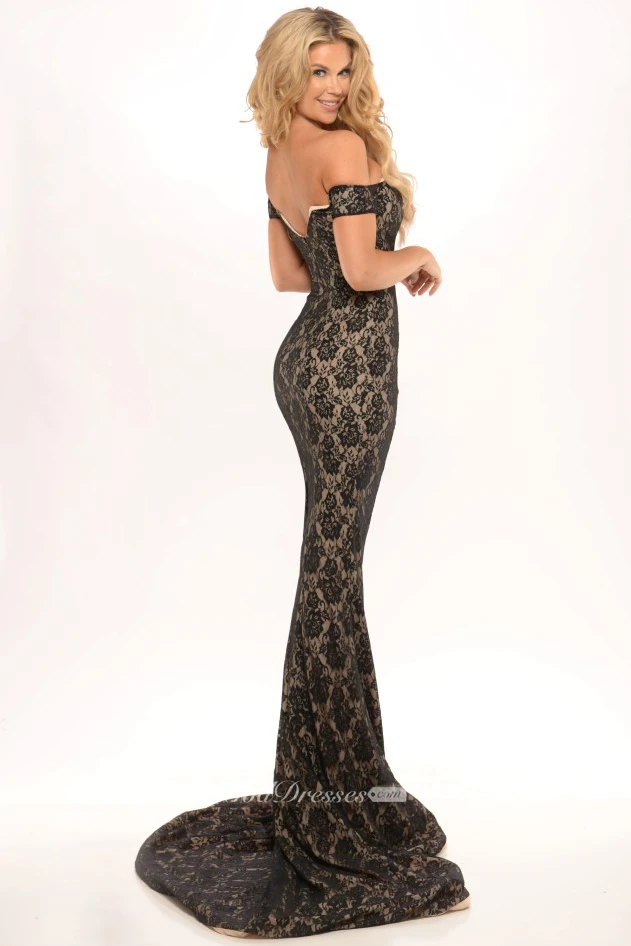 Maxi Off-The-Shoulder Lace Prom Dress With Sweep Train And V Back