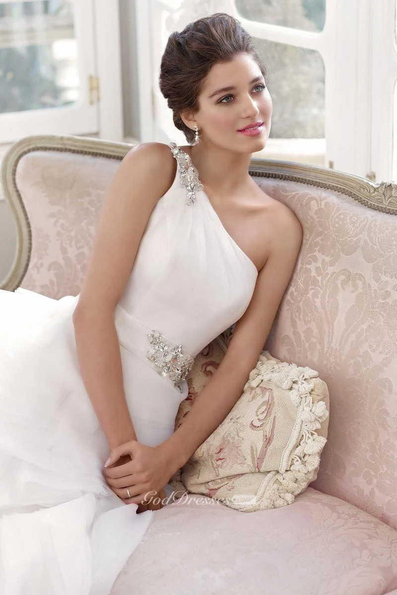 Maxi One-Shoulder Jeweled Organza Wedding Dress With Chapel Train And Corset Back