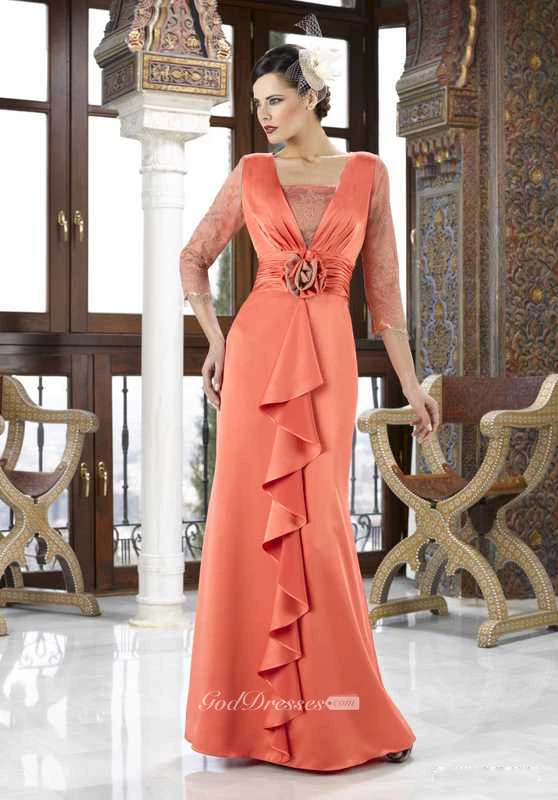 Maxi Square Neck Appliqued 3-4 Sleeve Chiffon Mother Of The Bride Dress
