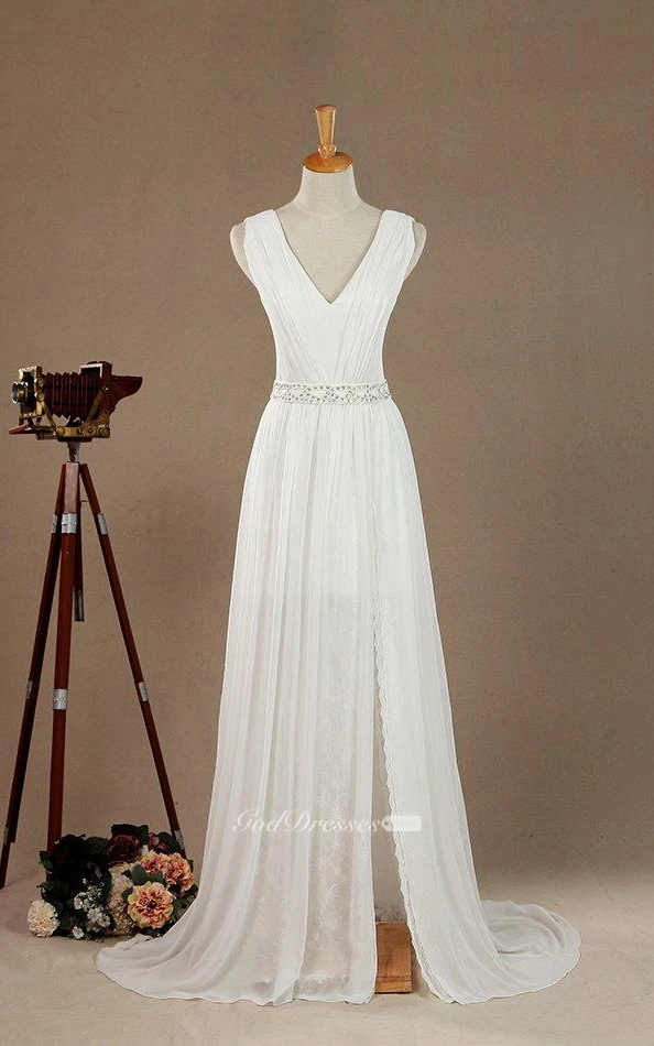 Maxi V-Neck Chiffon Lace Satin Weddig Dress With Low-V Back