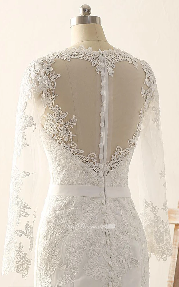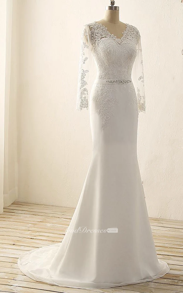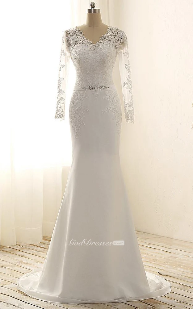 Maxi V-Neck Long Sleeve Beading Sweep Train Lace Satin Dress