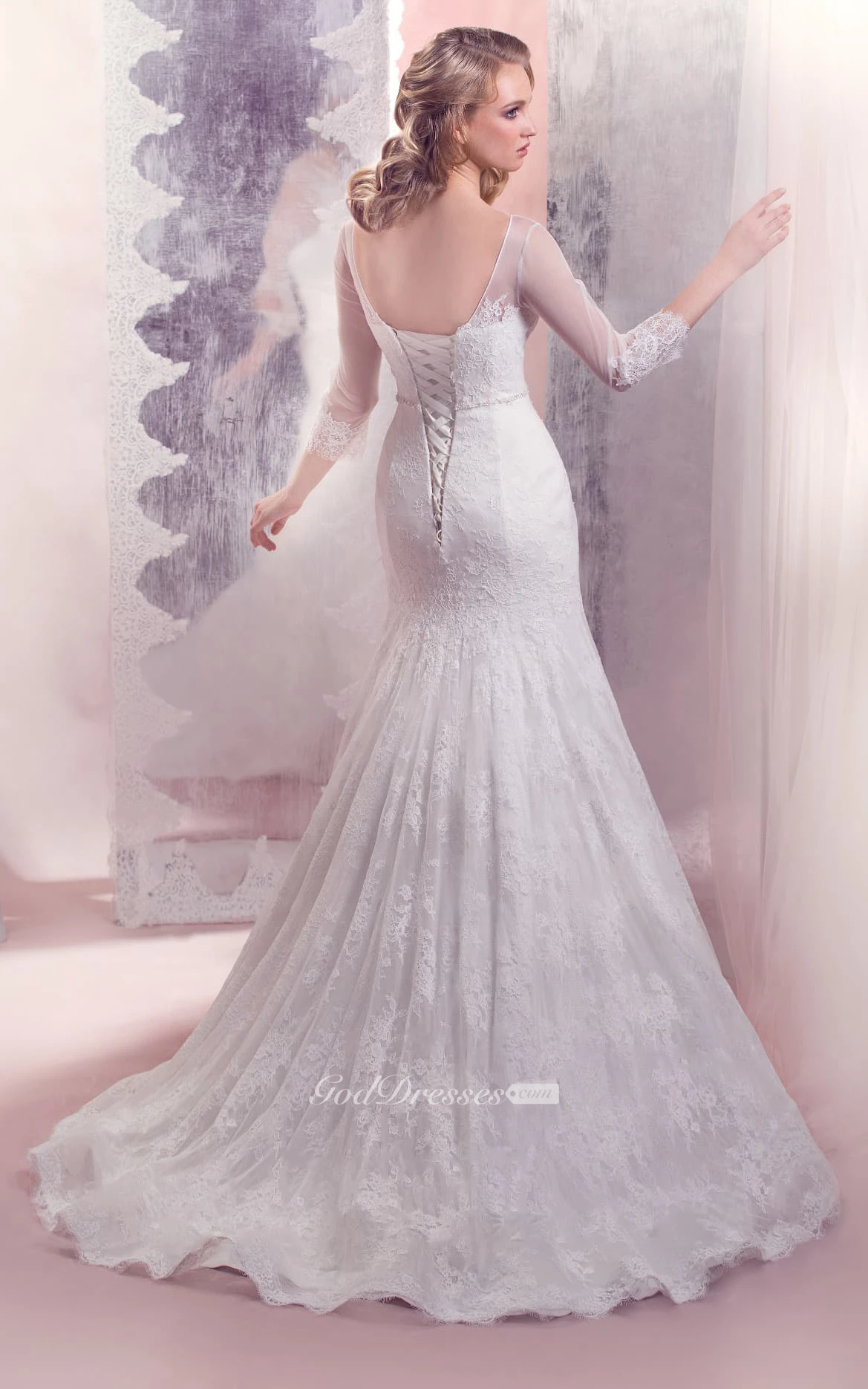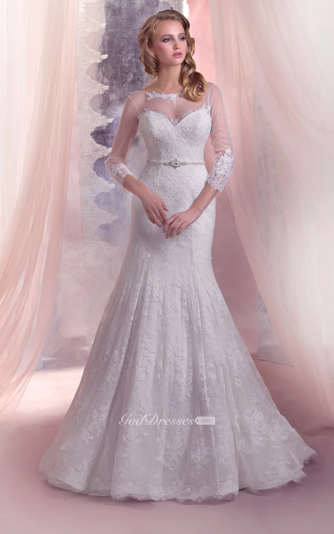Mermaid Floor-Length Bateau-Neck Illusion-Sleeve Lace-Up Lace Dress With Beading