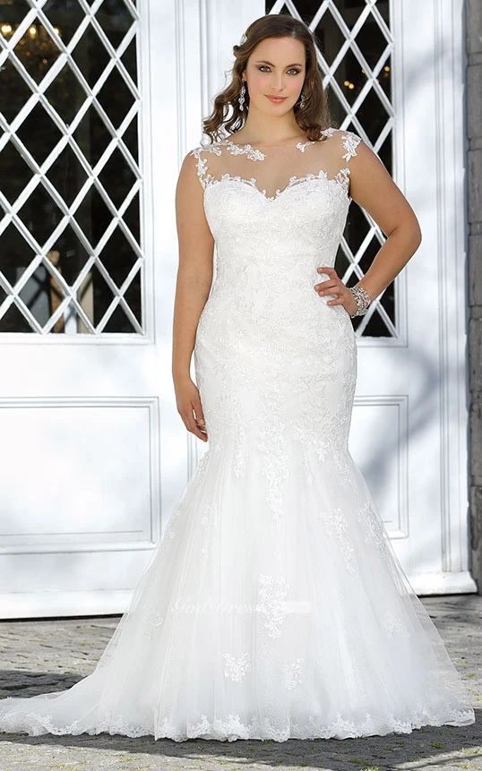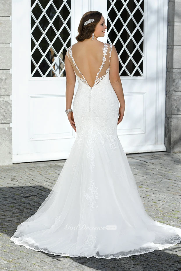Mermaid Floor-Length Bateau Neck Sleeveless Lace Sweep Train Deep-V Back Appliques Dress