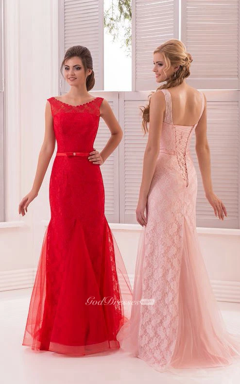 Mermaid Floor-Length Bateau Short Sleeve Tulle Lace Sash Lace-Up Dress