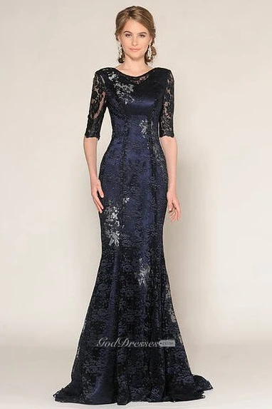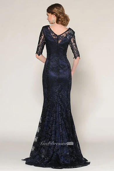 Mermaid Floor-Length Half-Sleeve Scoop-Neck Appliqued Lace Prom Dress