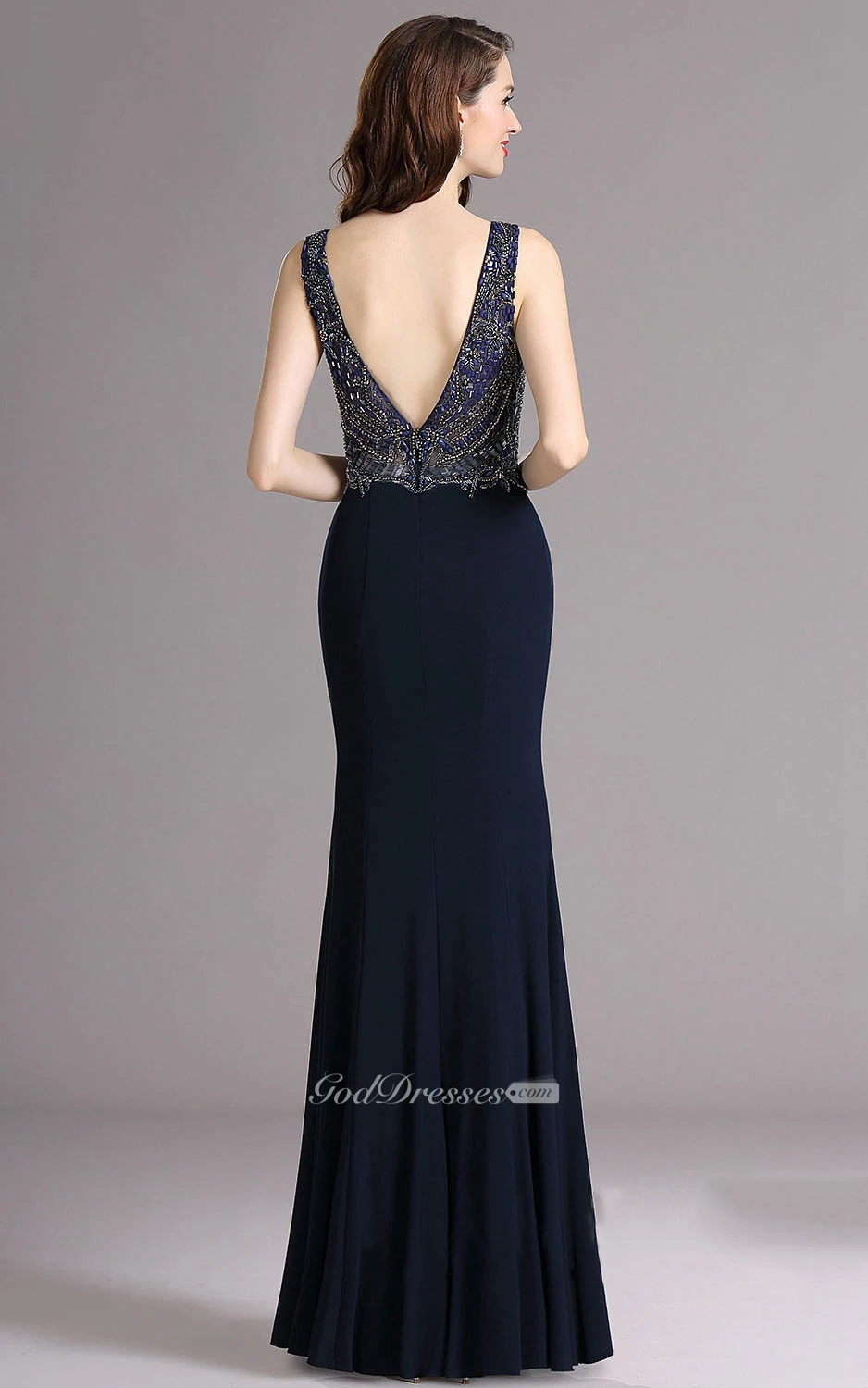 Mermaid Floor-Length Jewel Sleeveless Satin Beading Appliques Low-V Back Dress