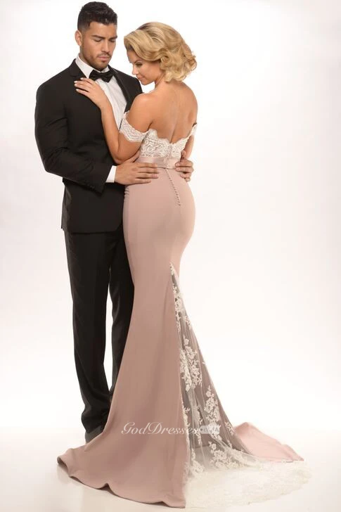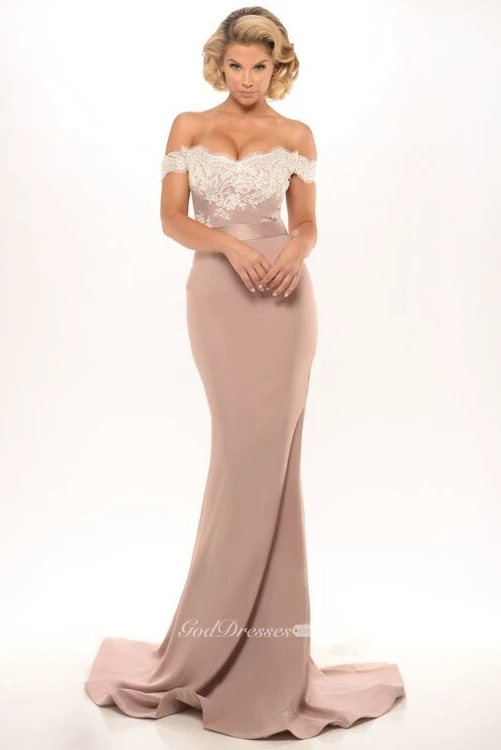 Mermaid Floor-Length Off-The-Shoulder Appliqued Jersey Prom Dress With Backless Style And Sweep Train