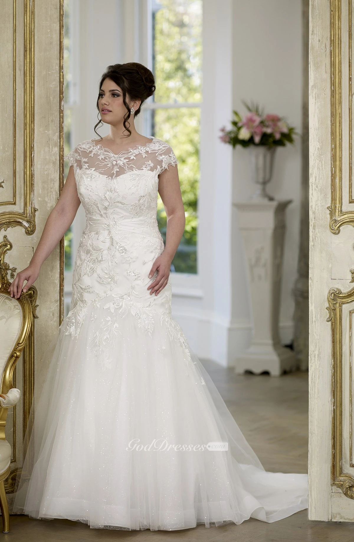 Mermaid Floor-Length Scoop Neck Short Sleeve Tulle Court Train Lace-Up Back Embroidery Dress