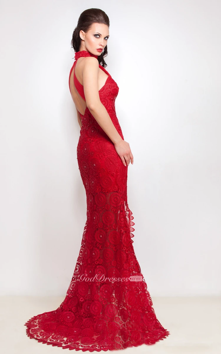 Mermaid Floor-Length Sweep Halter Sleeveless Lace Split Front Beading Straps Dress
