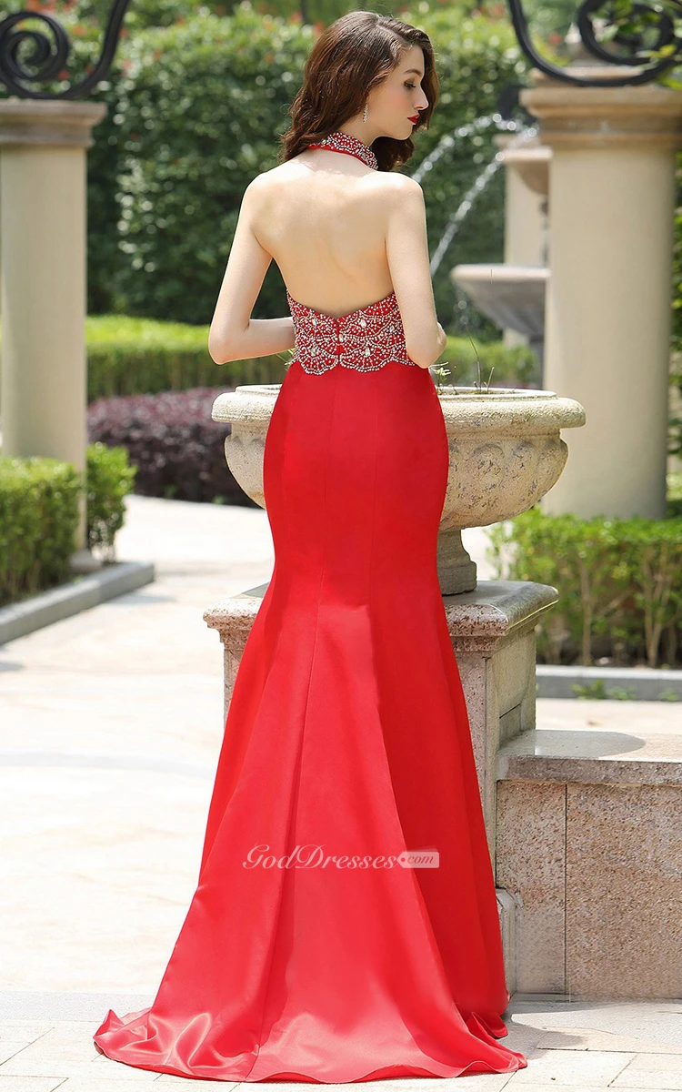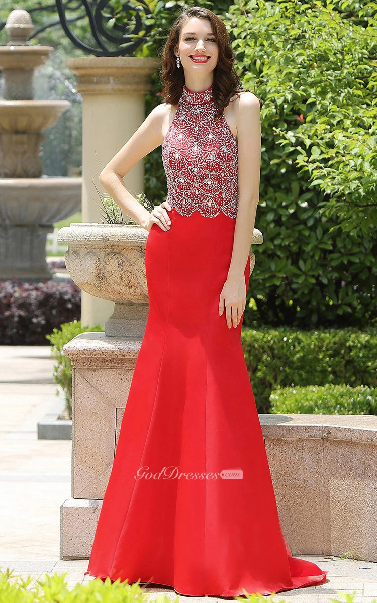 Mermaid Floor-Length Sweep Jewel Sleeveless Taffeta Beading Backless Dress