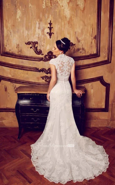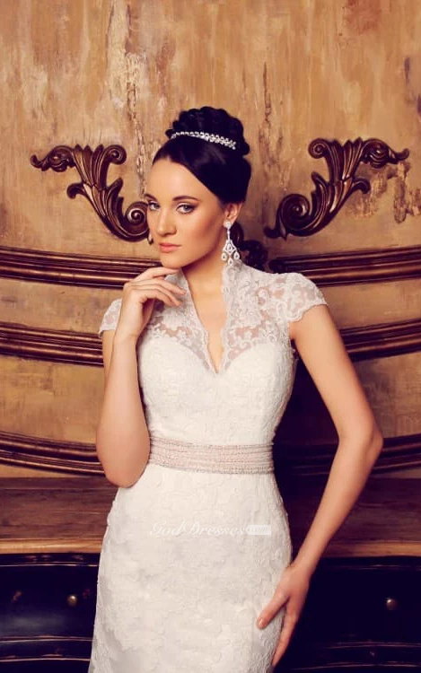 Mermaid Floor-Length V-Neck Cap-Sleeve Illusion Lace Dress With Appliques And Waist Jewellery