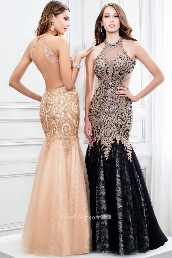 Mermaid High Neck Sleeveless Appliqued Tulle Prom Dress With Keyhole