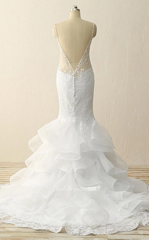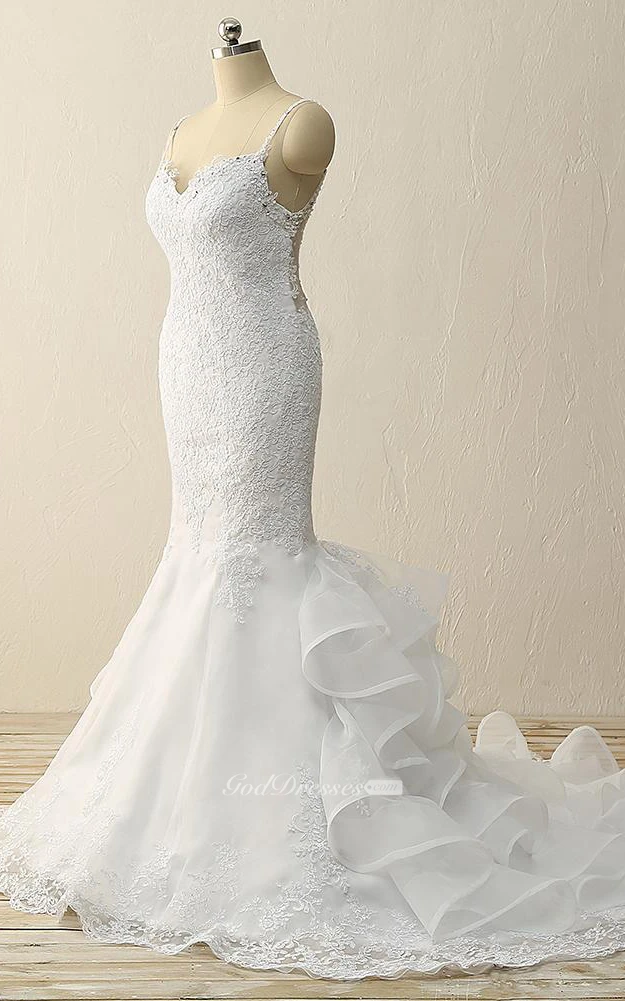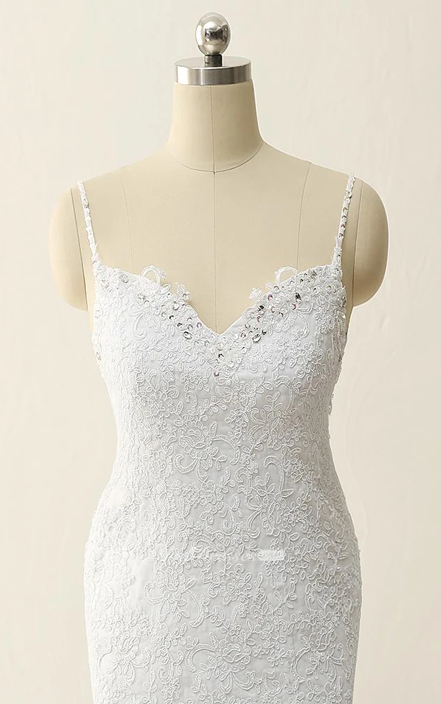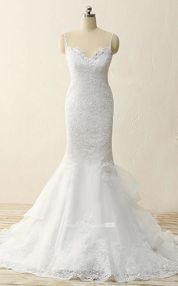 Mermaid Knee-Length Spaghetti Straps Sweetheart Bell Beading Appliques Chapel Train Button Zipper Straps Lace Sequins Organza Satin Dress