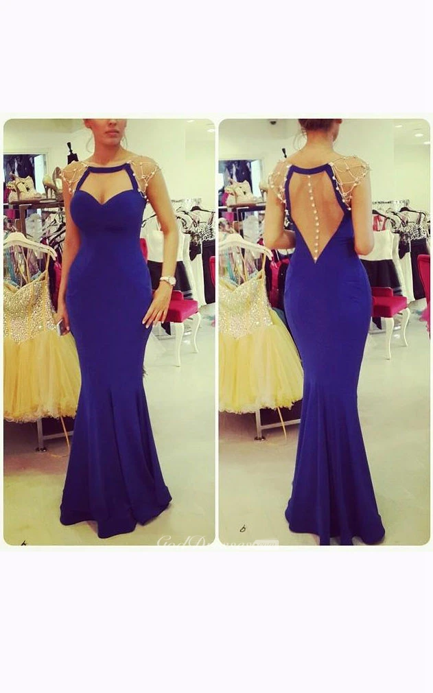Mermaid Long Cap-sleeved Illusion Beading Zipper Lace Satin Dress