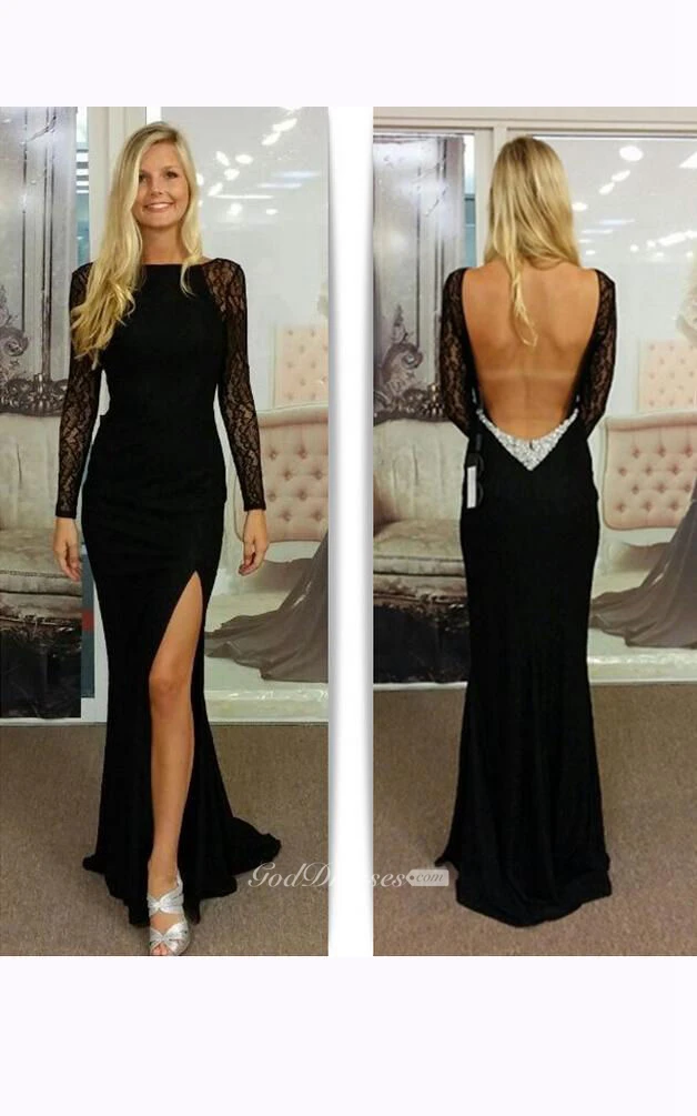 Mermaid Long Lace Sleeves Chiffon Dress with Deep V Back