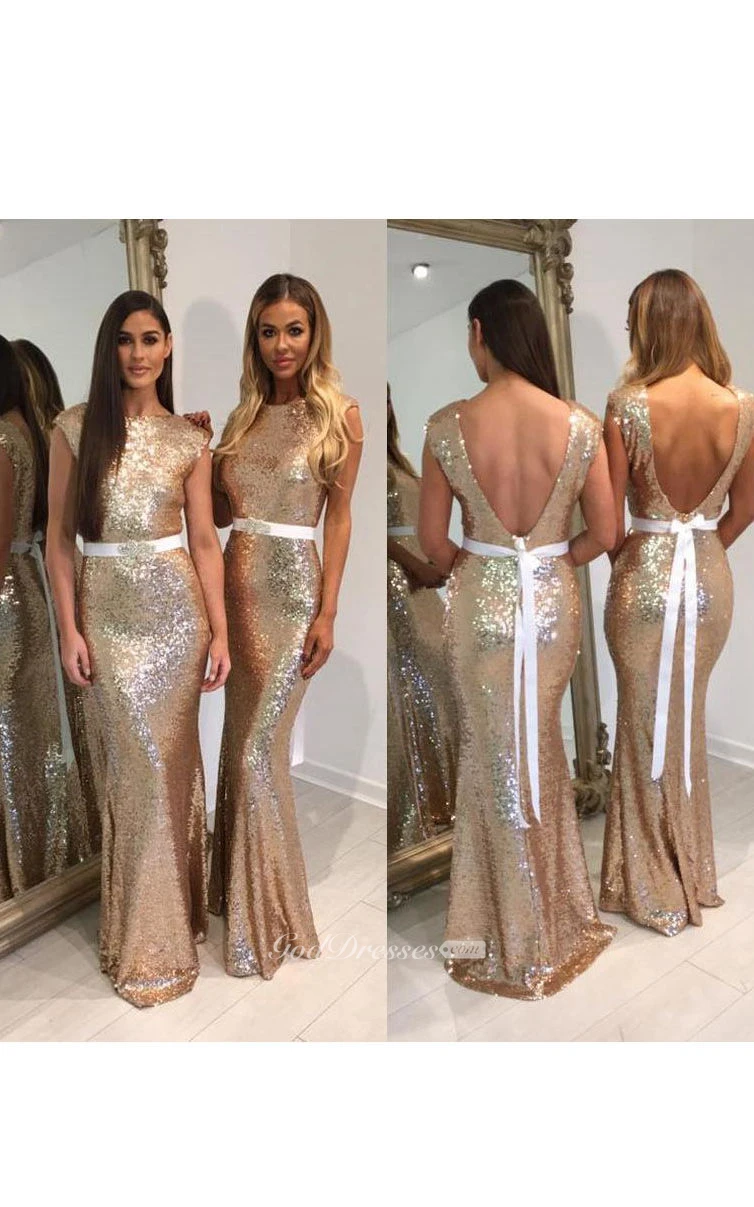 Mermaid Long Scoop Cap Sequins Dress with Deep V Back