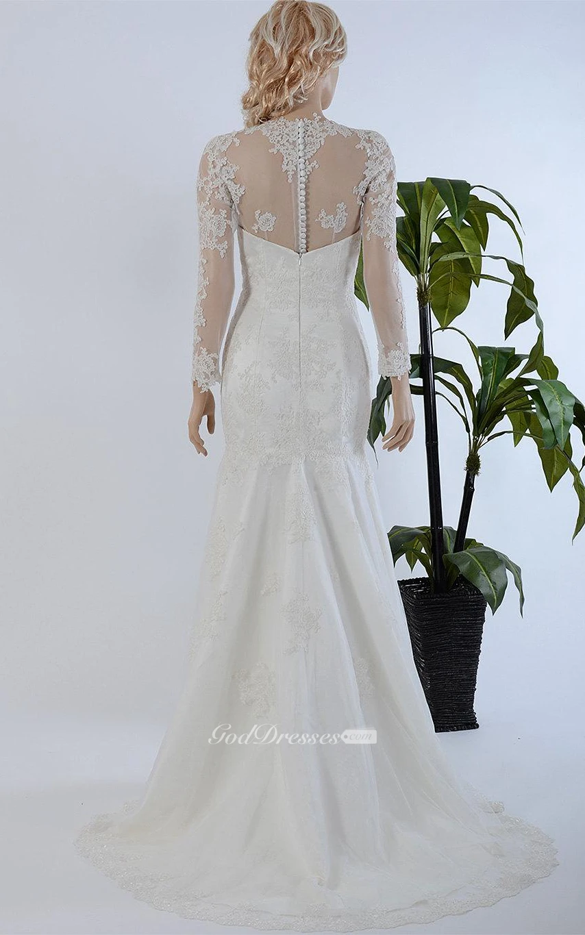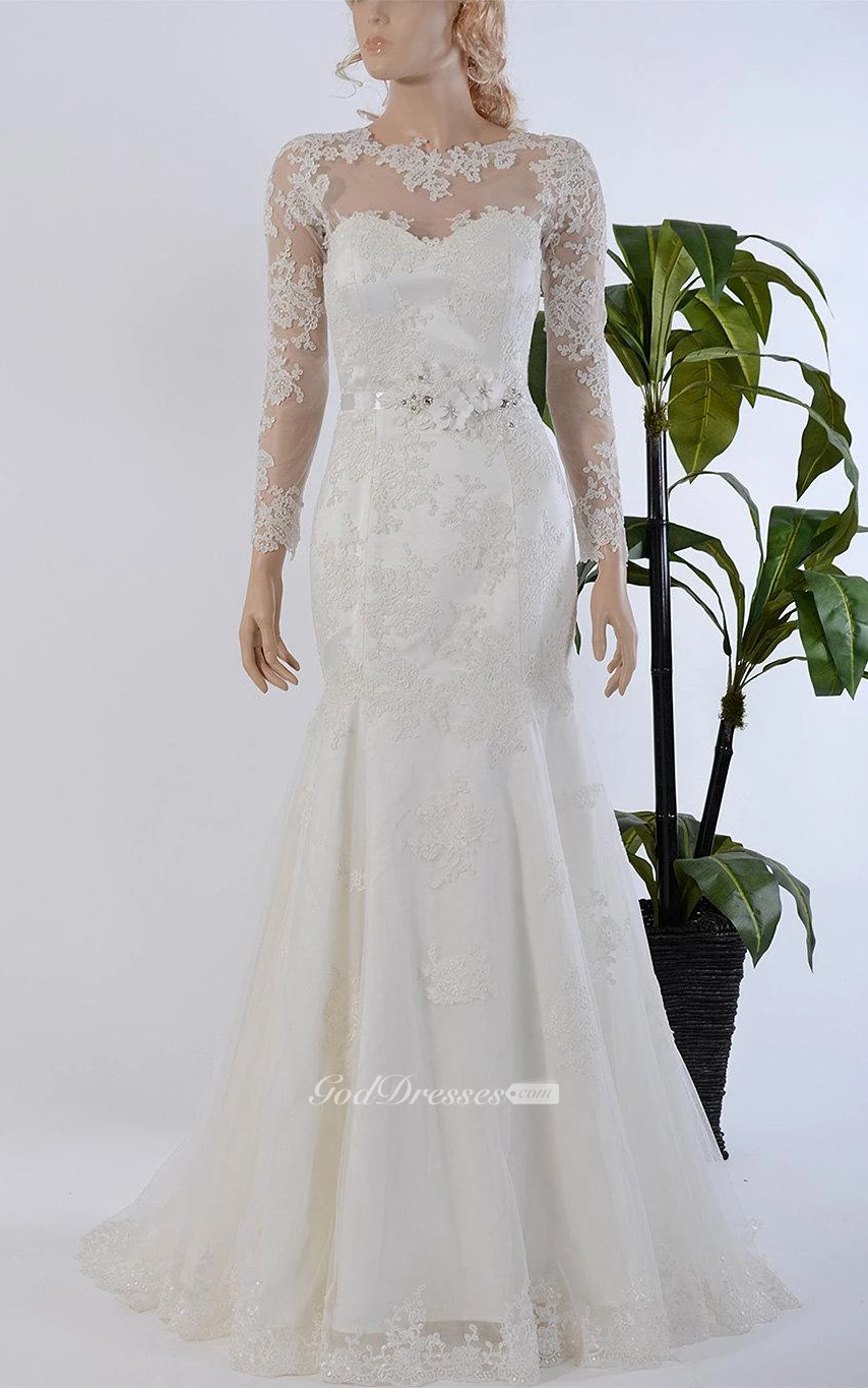 Mermaid Long Sleeve Lace Dress With Illusion Back and Beaded Flowers
