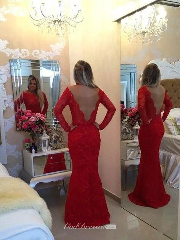 Mermaid Long Sleeves Scoop Lace Sash Sweep Train Dresses