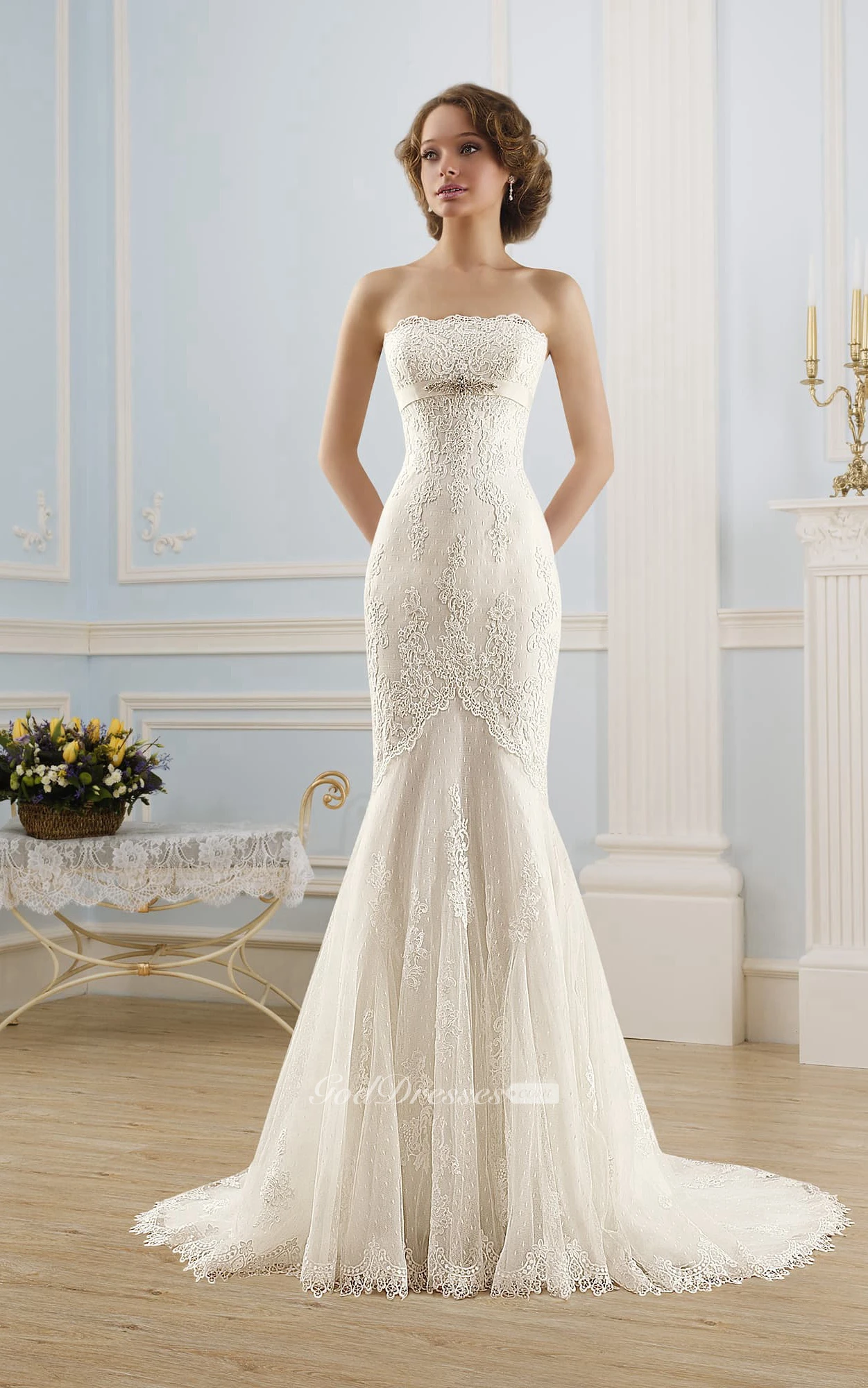 Mermaid Long Strapless Sleeveless Corset-Back Lace Tulle Dress With Appliques And Beading