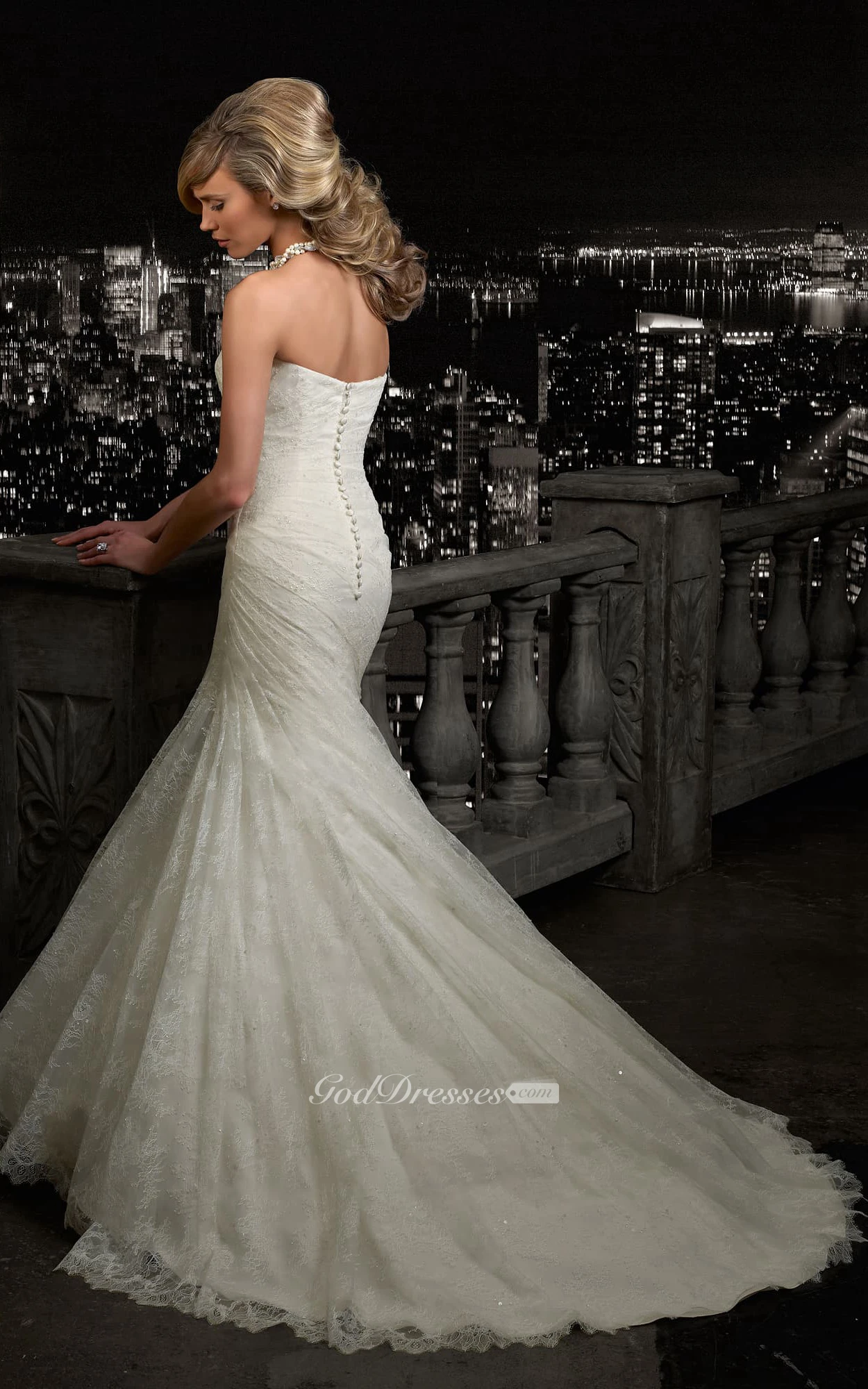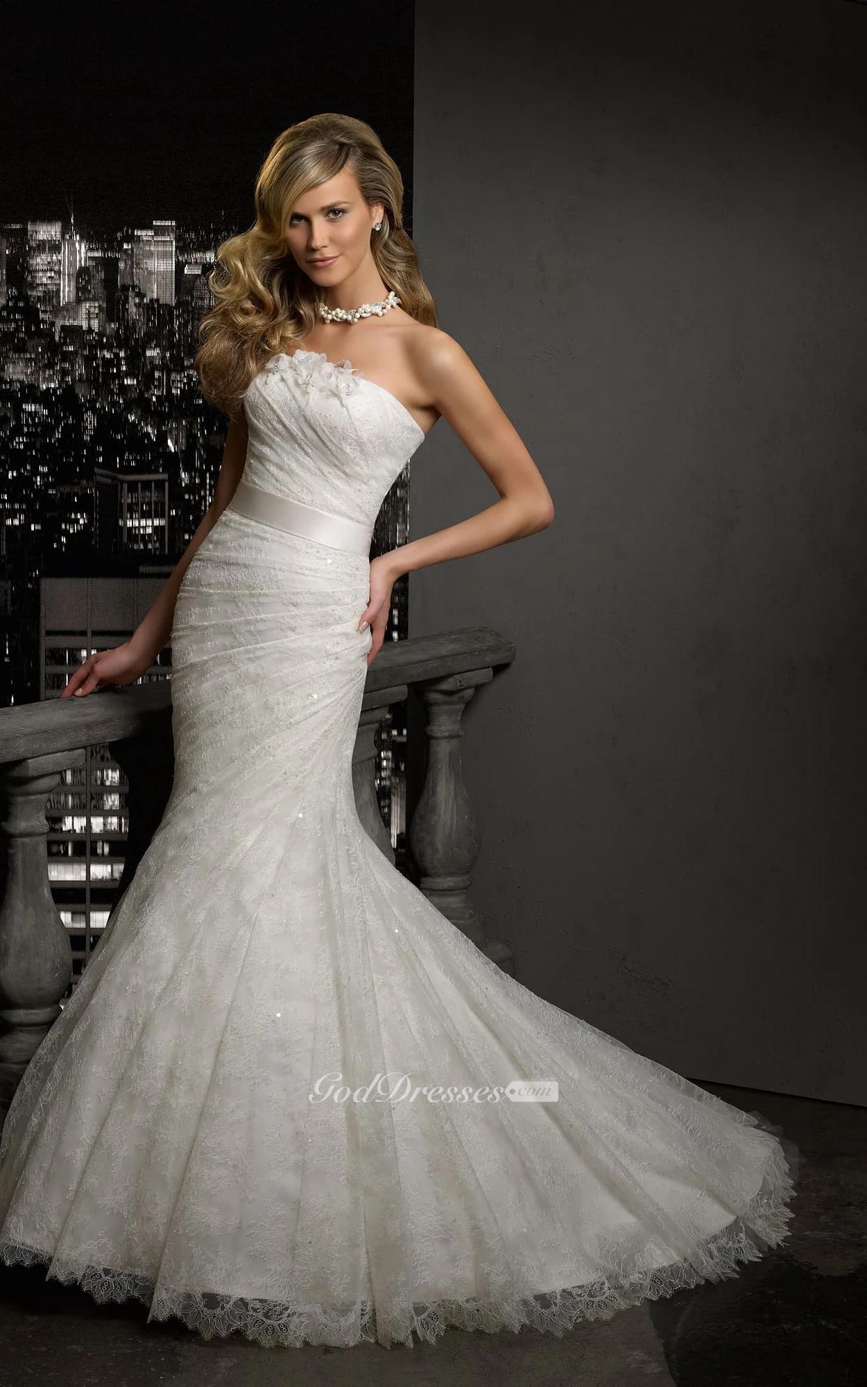 Mermaid Long Strapless Sleeveless Lace Dress With Side Draping And Flower