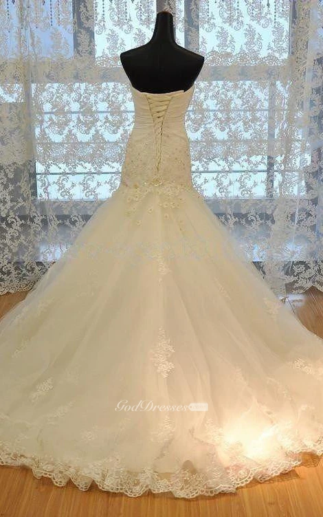 Mermaid Long Straps Sleeveless Bell Ruffles Lace-Up Back Straps Lace Organza Satin Dress