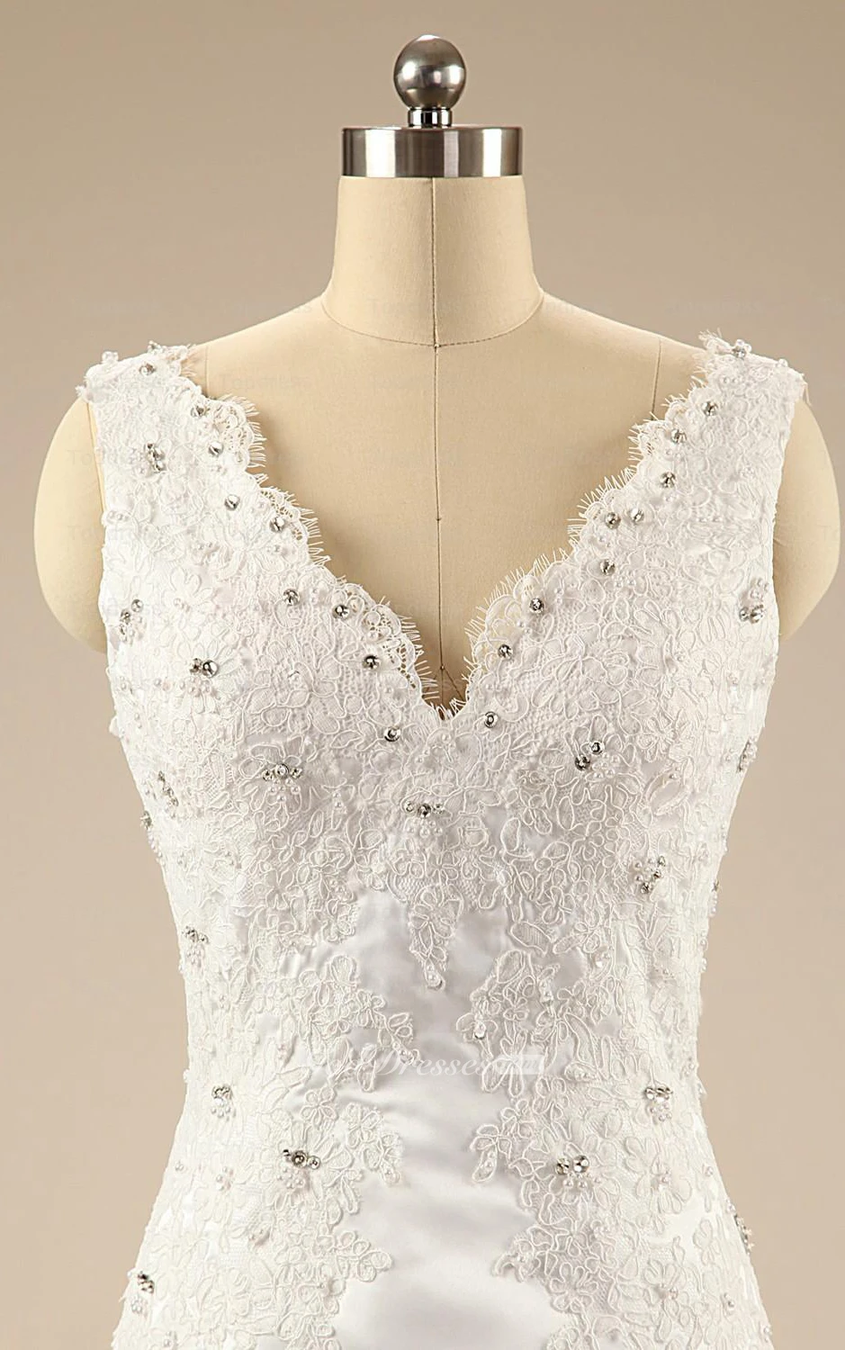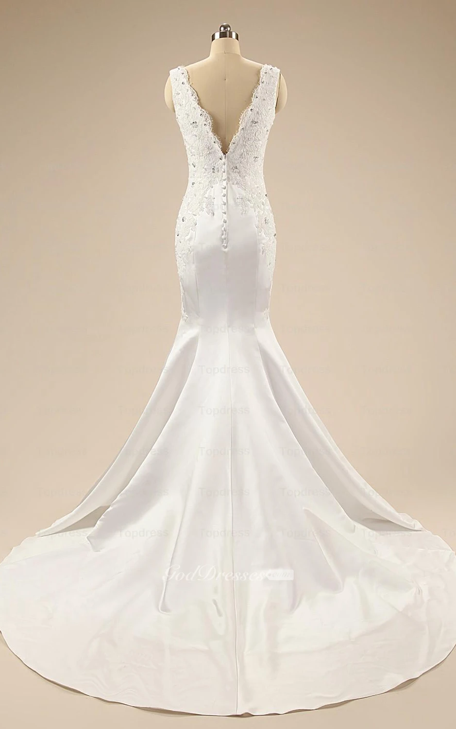 Mermaid Long V-Neck Beading Backless Lace Satin Dress