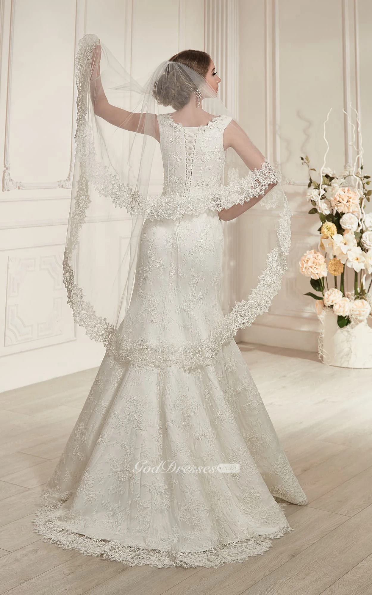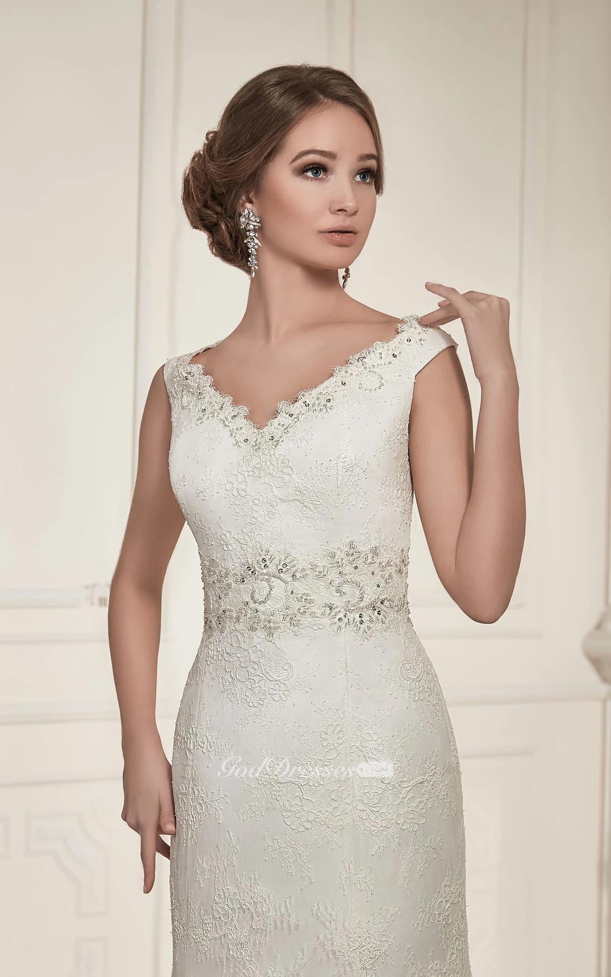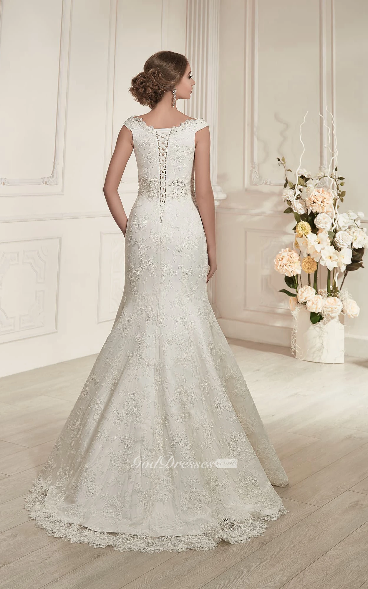 Mermaid Long V-Neck Sleeveless Lace-Up Lace Dress With Beading