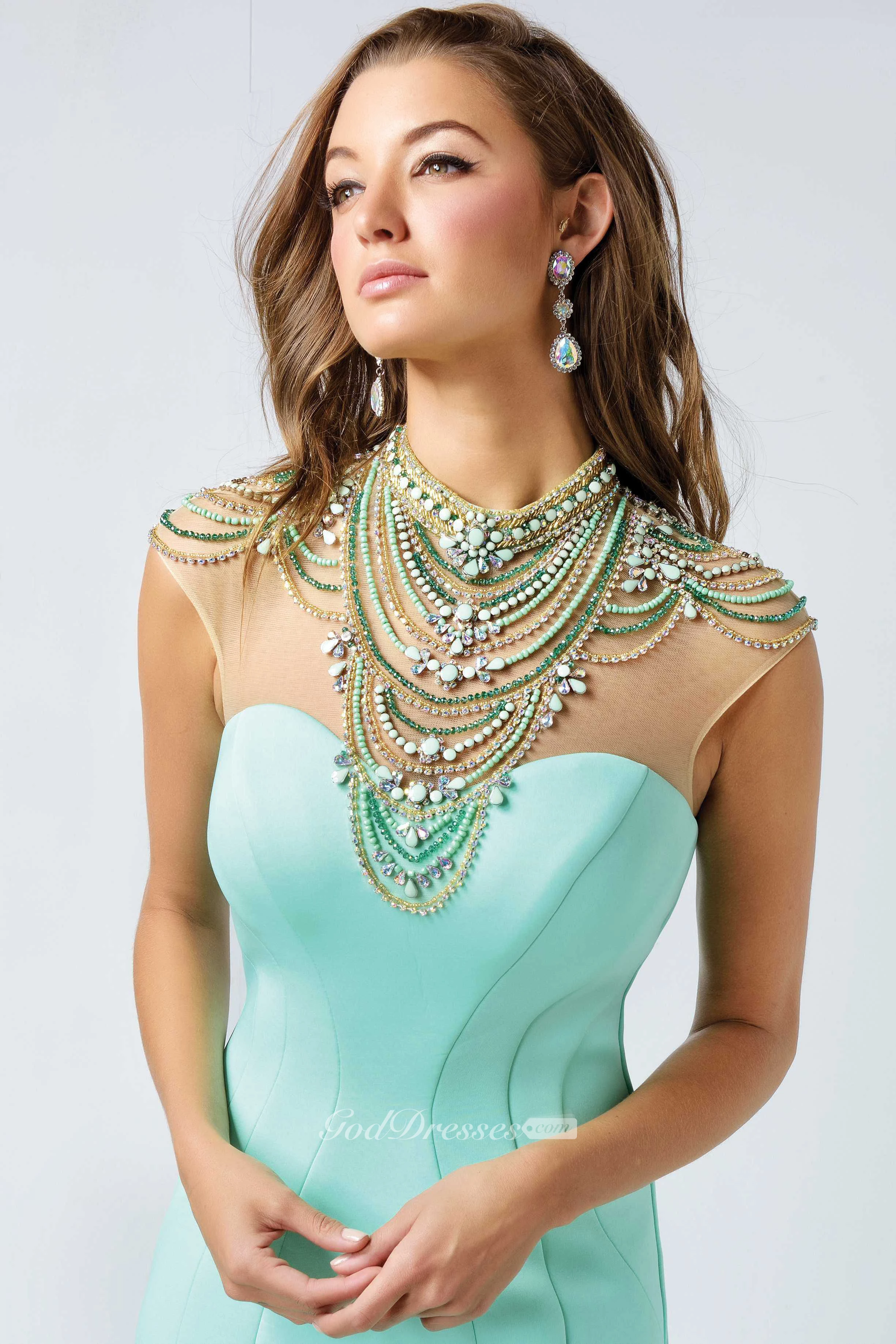 Mermaid Maxi High Neck Sleeveless Jersey Keyhole Dress With Beading