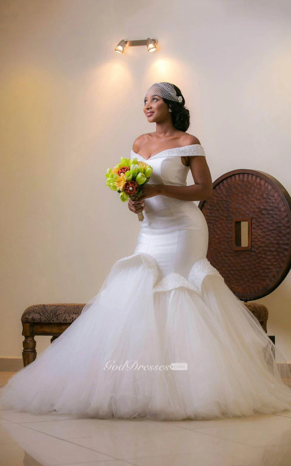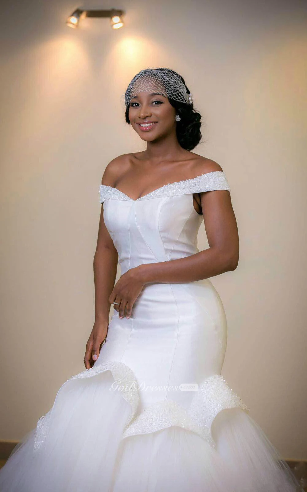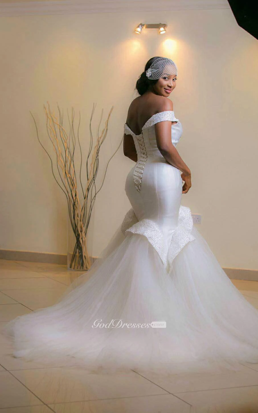 Mermaid Mini Off-The-Shoulder Sleeveless Bell Cap Beading Appliques Ruffles Sweep Train Corset Back Tulle Lace Dress