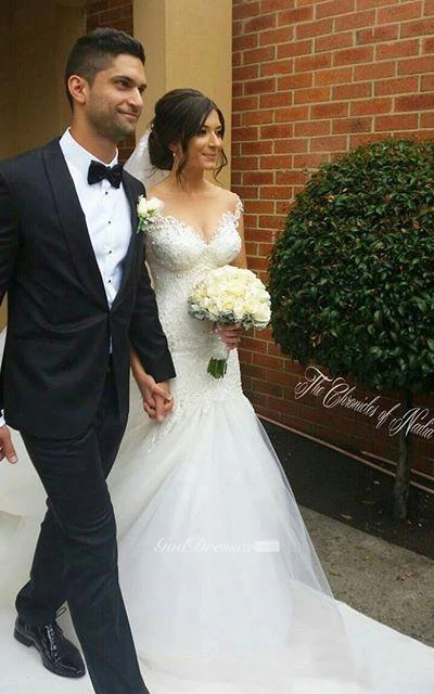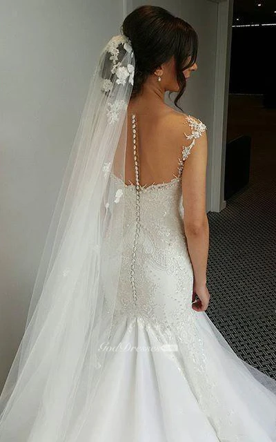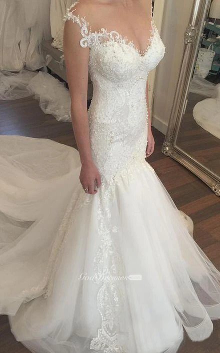 Mermaid Mini Sweetheart Bell Cap Illusion Beading Appliques Illusion Sweep Train Button Illusion Tulle Lace Dress